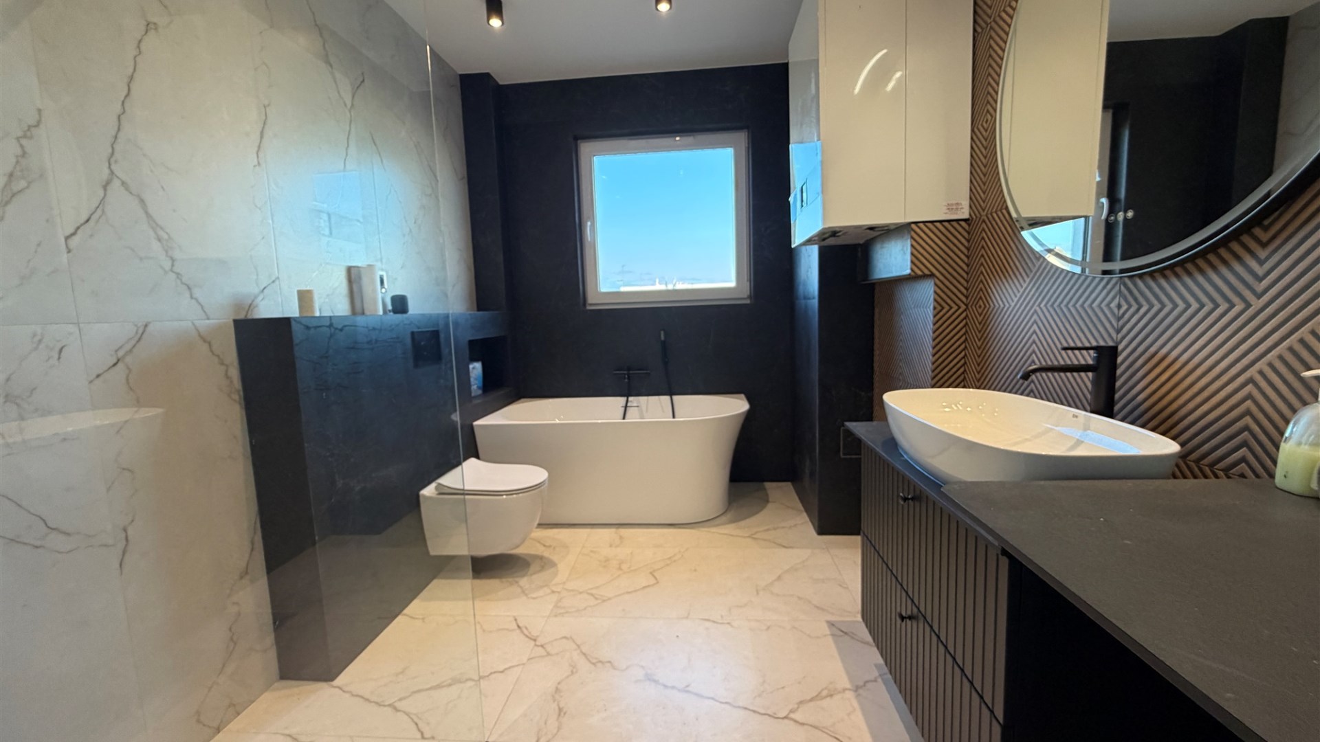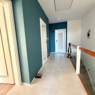 Piętro : 4 sypialnie ( podłogi panele), łazienka z kabina i wanną ( glazura i terakota)