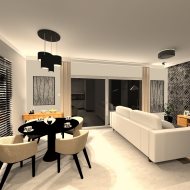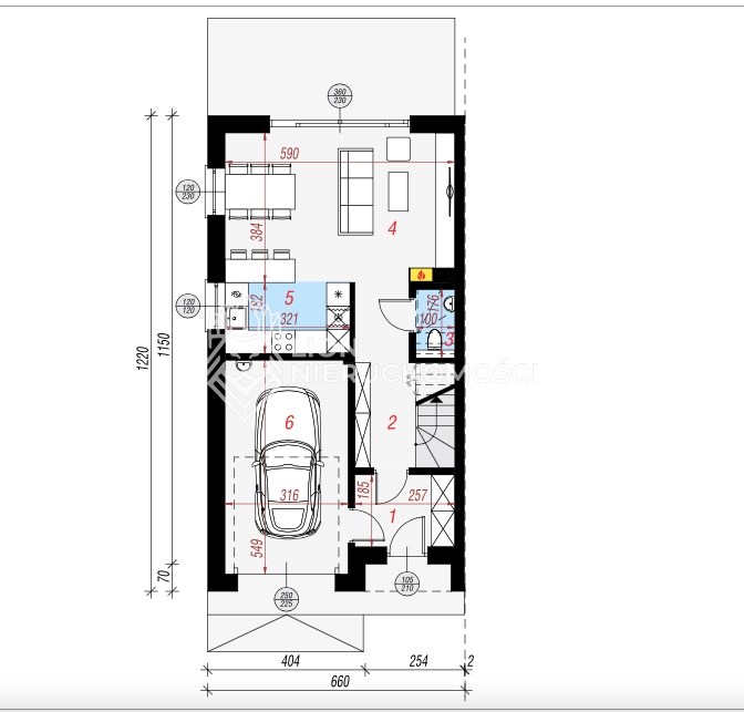 salon połączony z aneksem kuchennym, wyjście na duży taras, wc , z holu przejście do garażu.