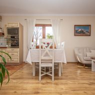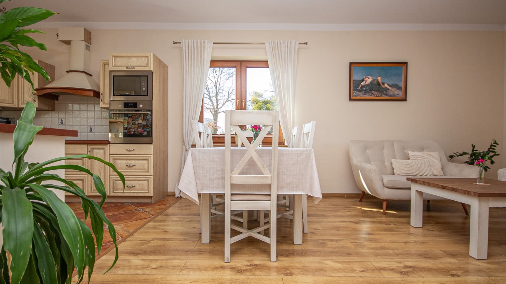 - przestronny salon z kominkiem, jadalnią i w pełni wyposażoną w sprzęty AGD kuchnią