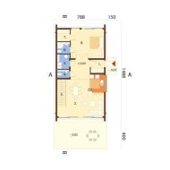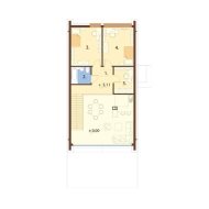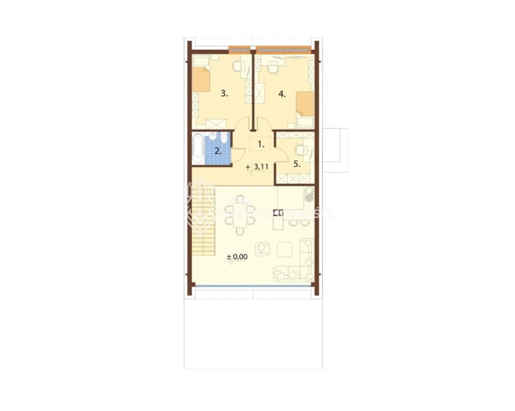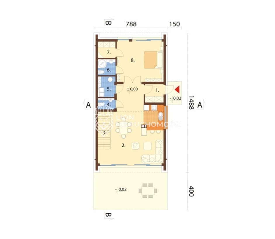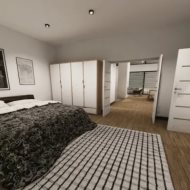 Z salonu można wyjść na taras i ogród, a także przejść na antresolę. Obok schodów na poddasze jest WC, a za nim pomieszczenie w którym jest kotłownia i pralnia. Ponadto wiatrołap, sypialnia z prywatną łazienką i garderobą.
