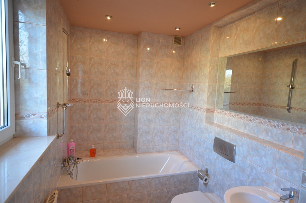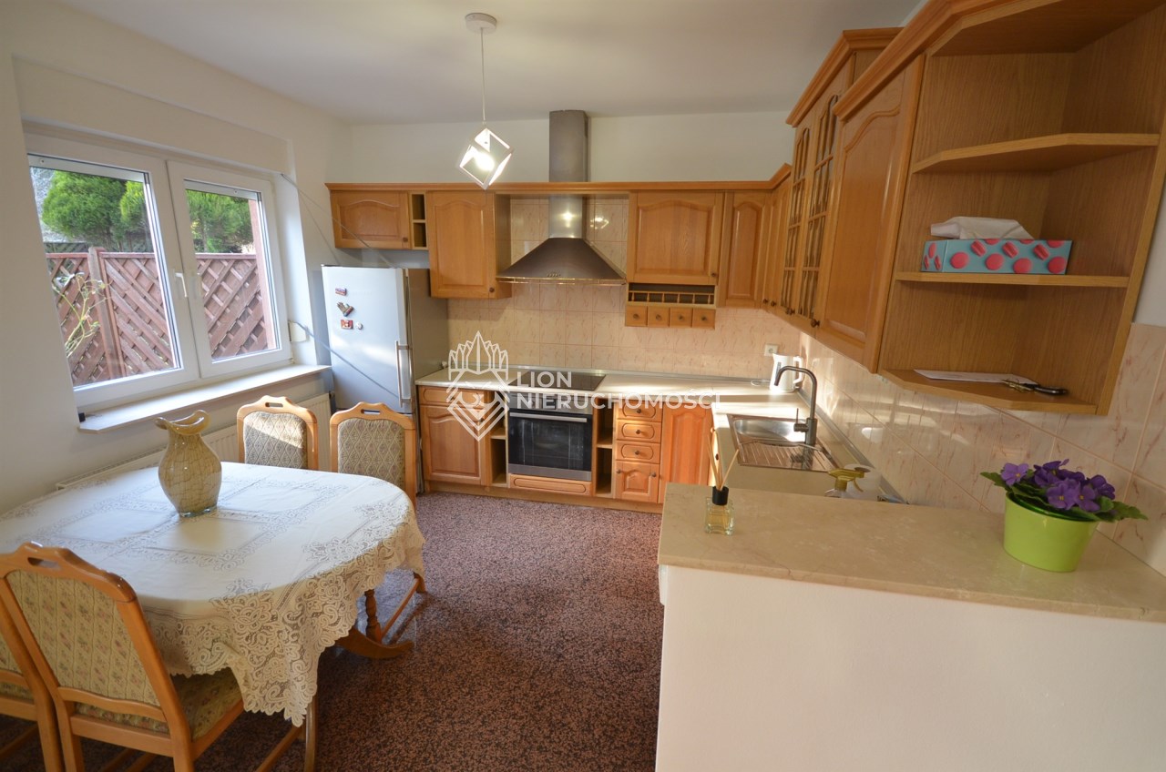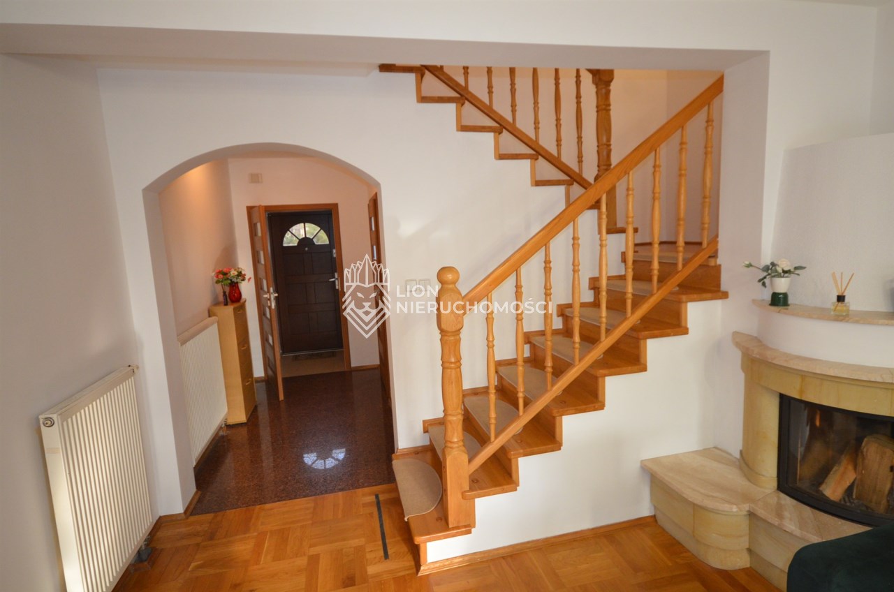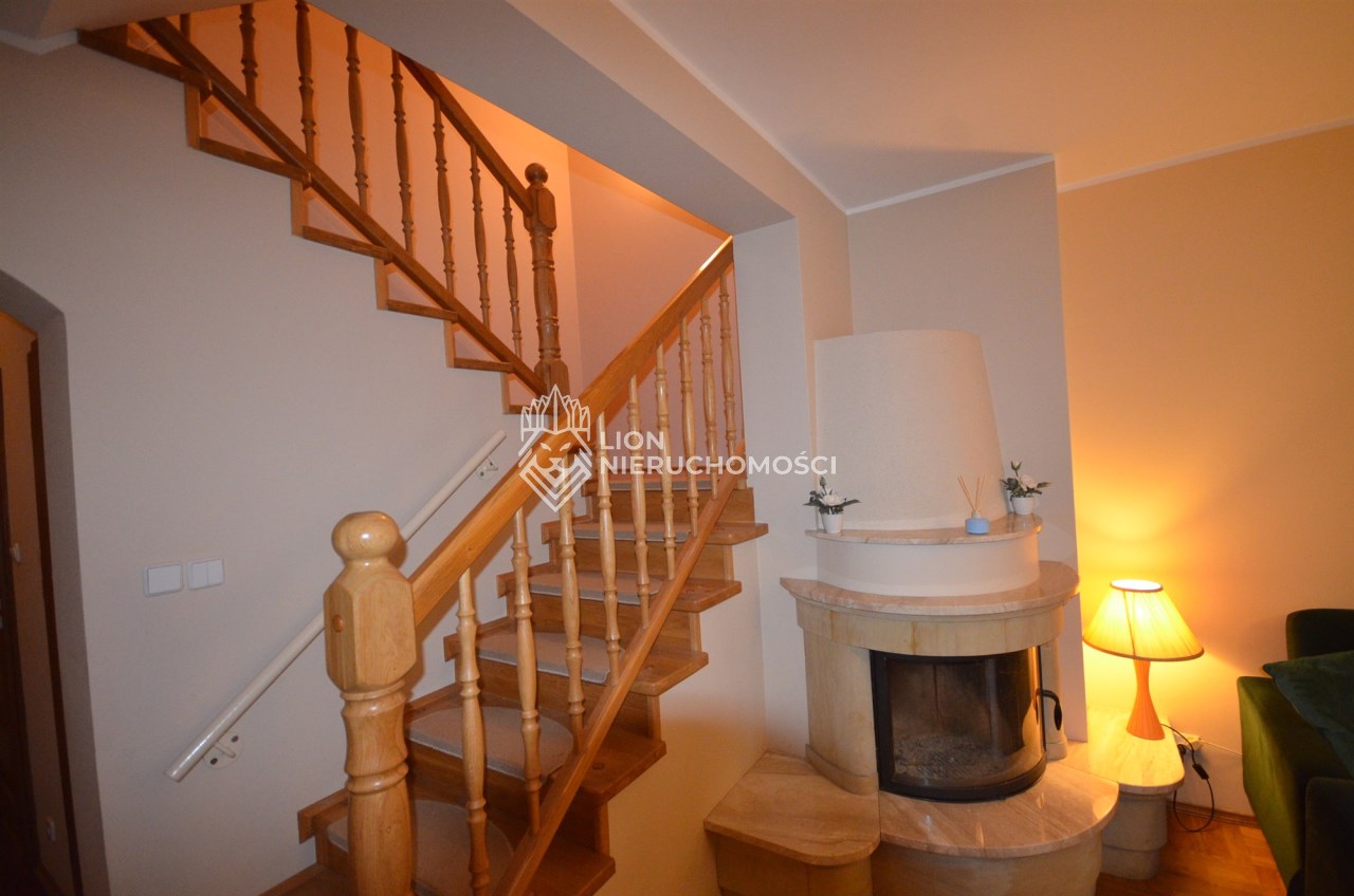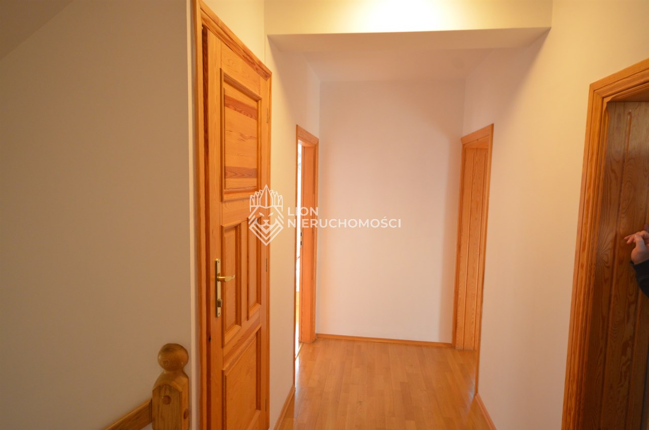 Na pierwszym piętrze znajdują się 3 pokoje, łazienka z wc i wanną. Na poddasze prowadzą również drewniane schody i jest tam zagospodarowany pokój, łazienka z wc oraz duży otwarty pokój z widokiem na ogród. Nieruchomość w pełni umeblowana w standardzie powyżej średniej, po remoncie 3 lata temu . Brama wjazdowa automatycznie zamykana na pilota.