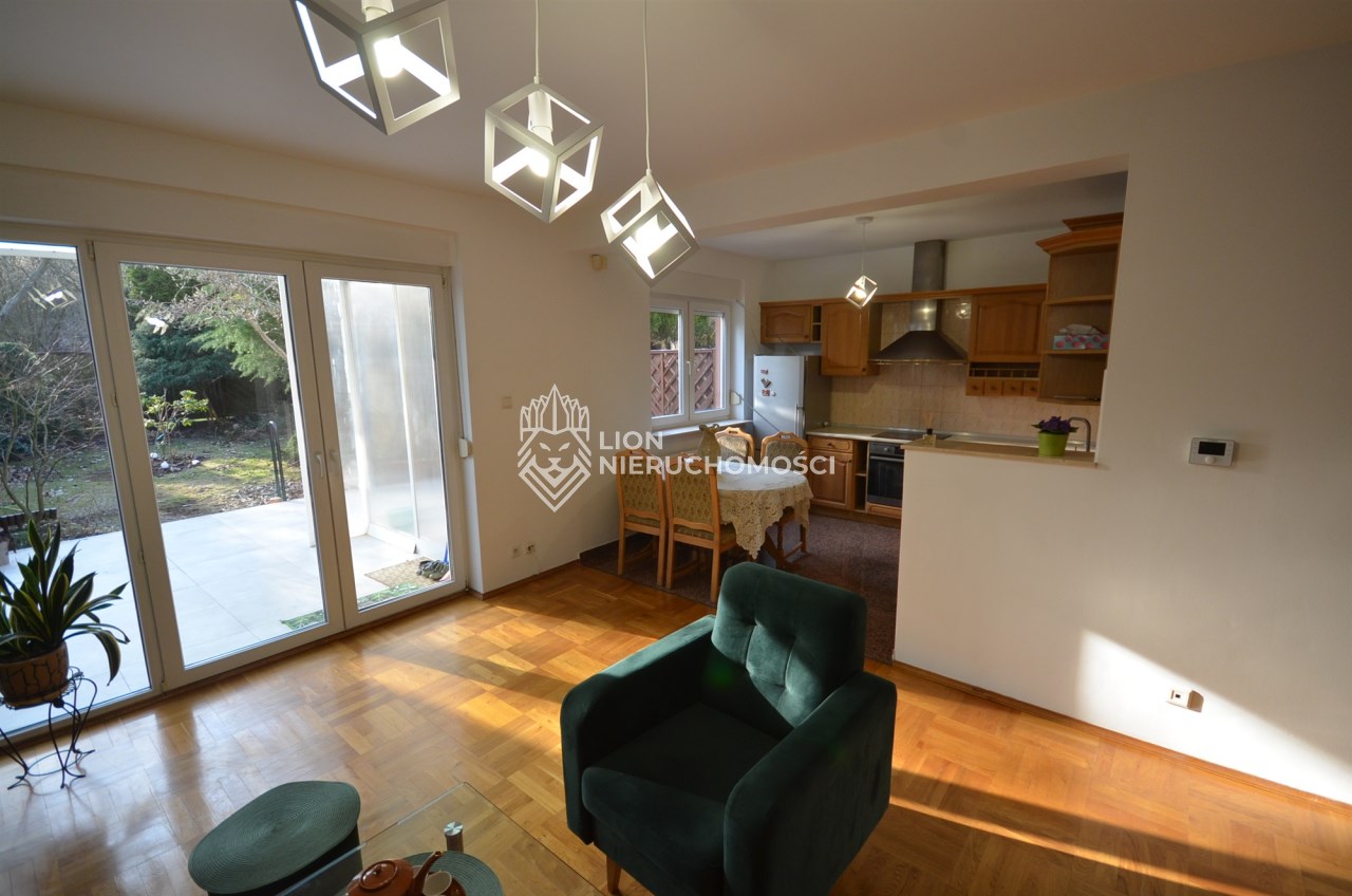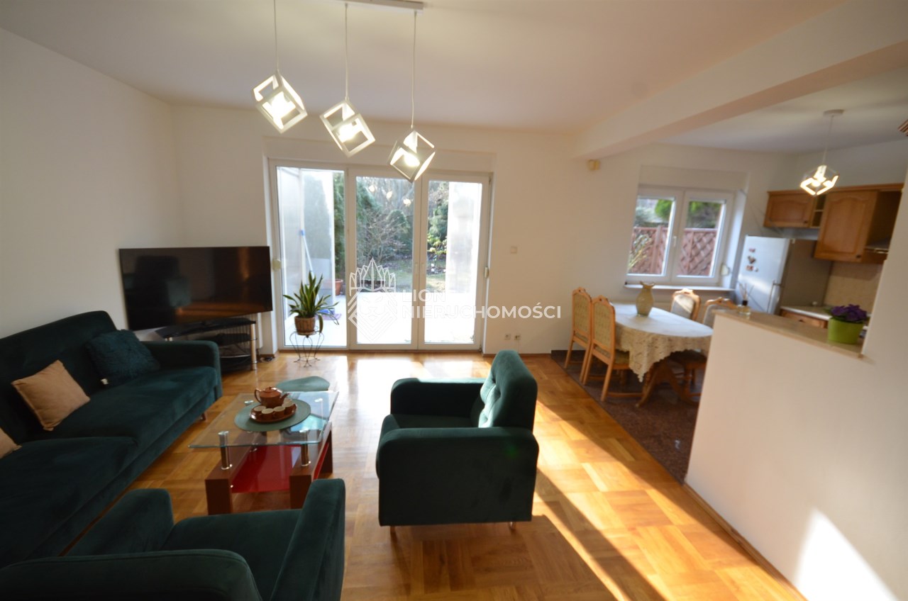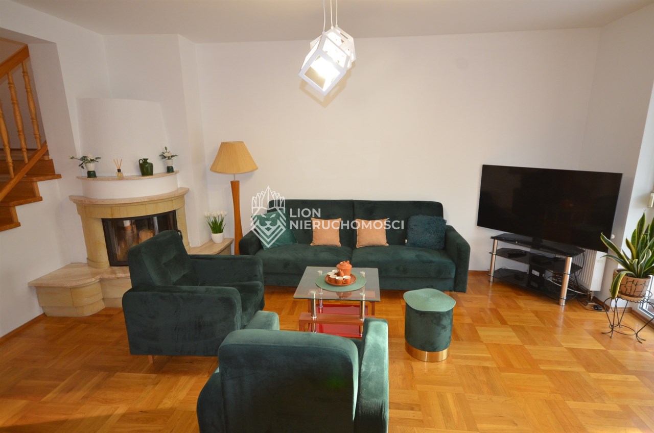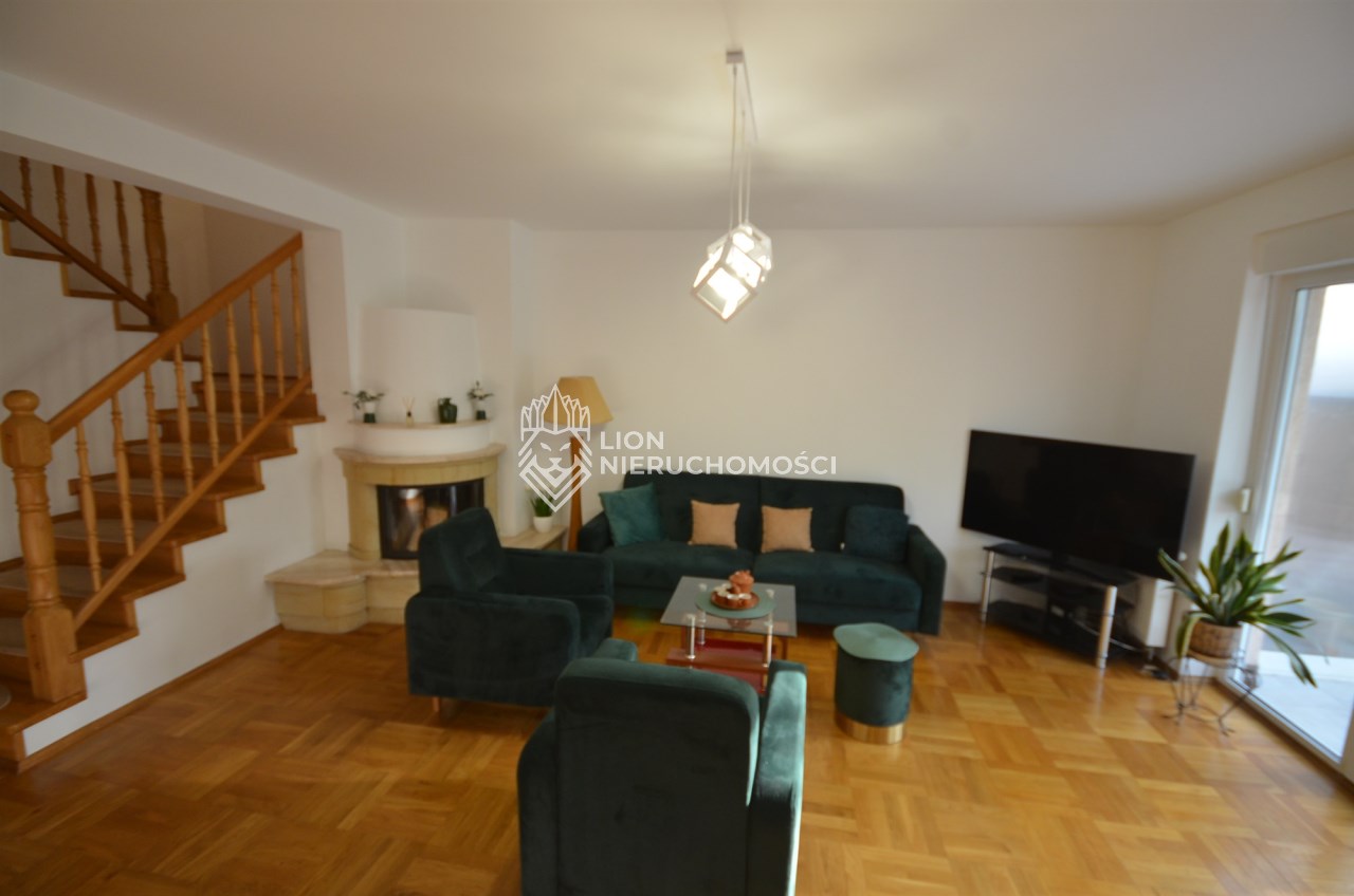 Na parterze salon z kominkiem i wyjściem na taras i do zagospodarowanego ogrodka ,otwarta kuchnia - umeblowana meblami dębowymi -wyposażona w agd, oraz łazienka z wc, przejście do długiego garażu zamykanego automatycznie na pilota.