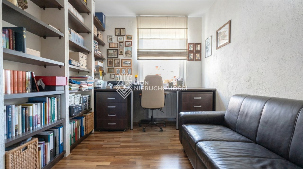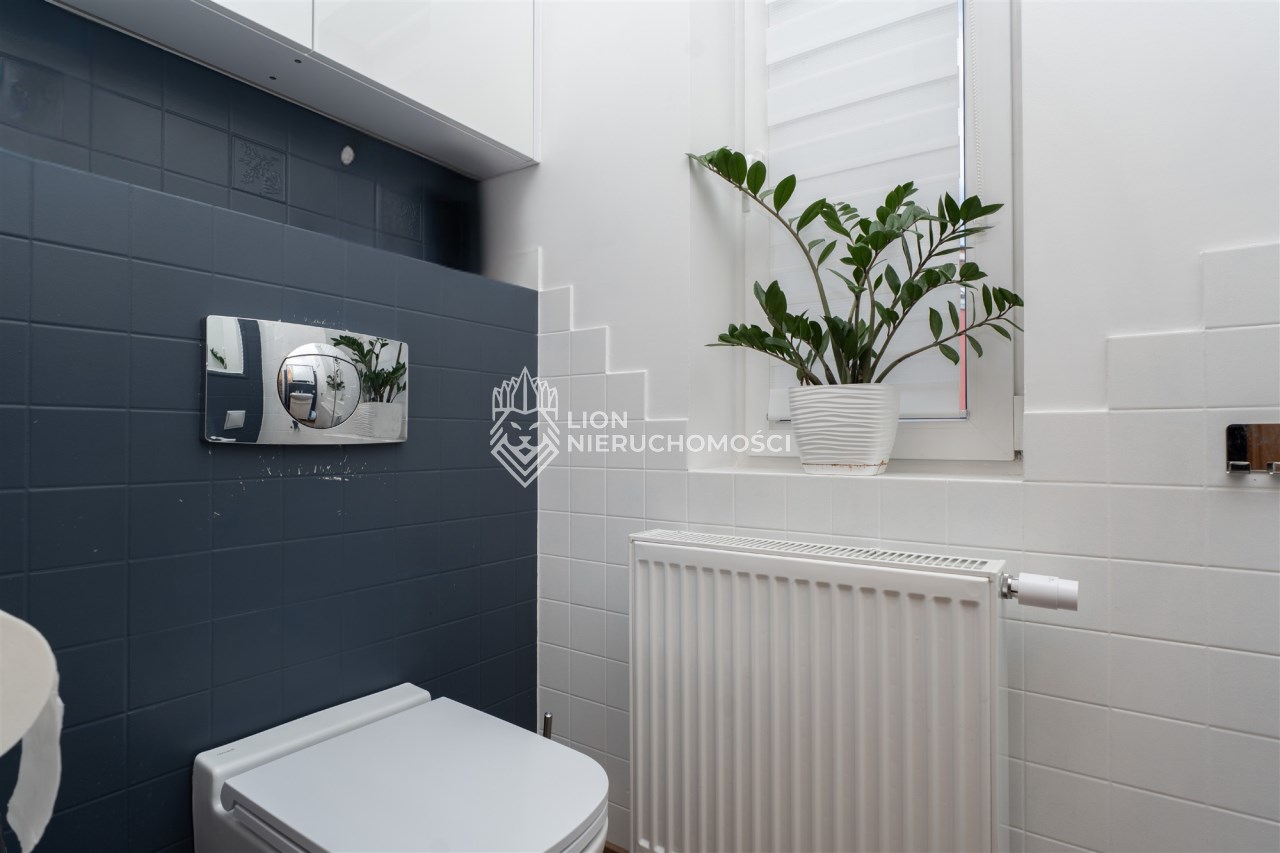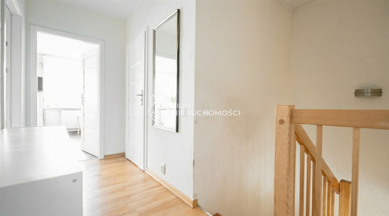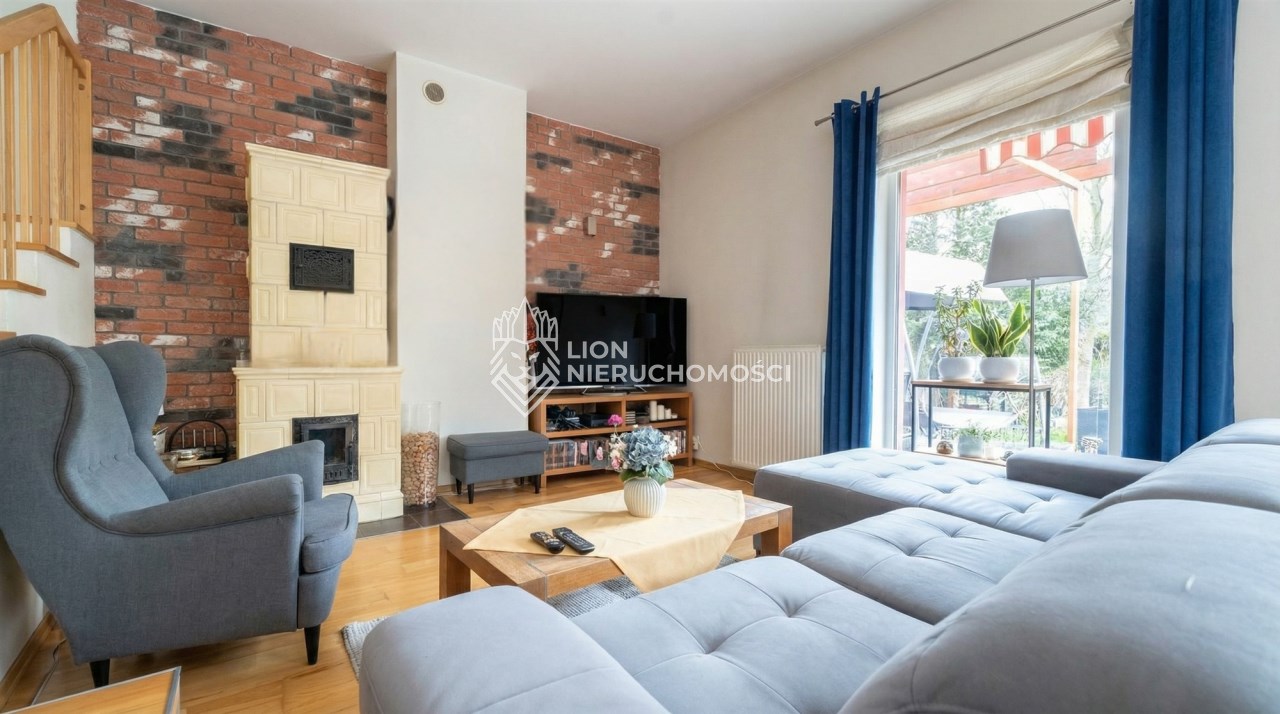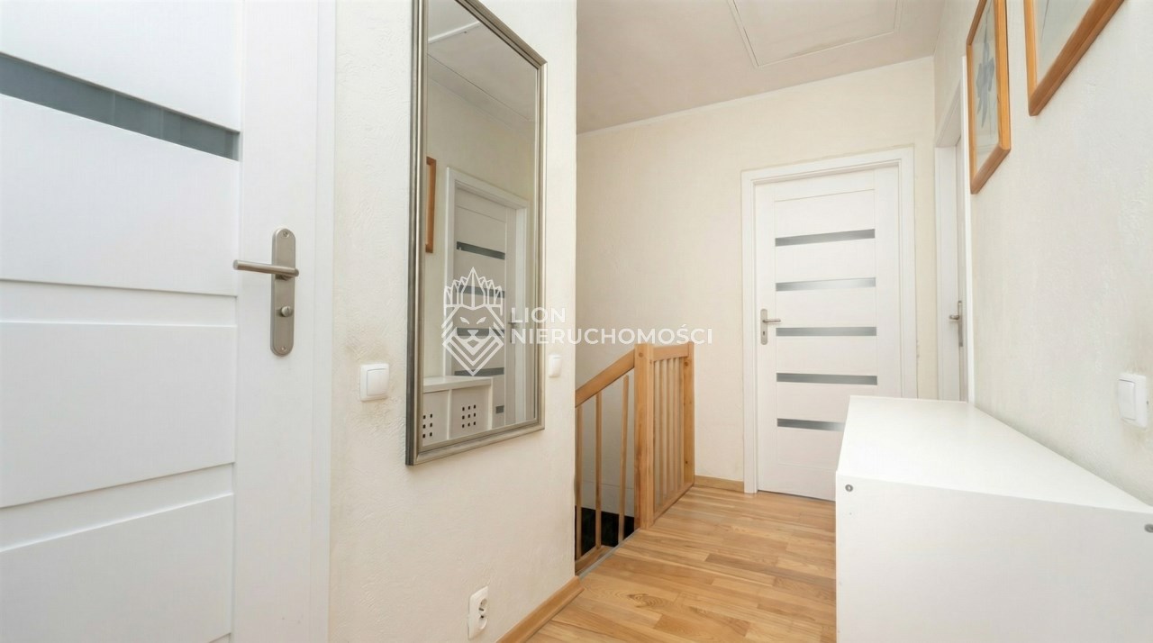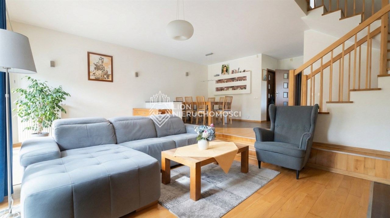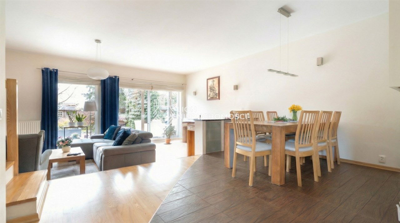 Parter to duży salon z otwartą kuchnia, podzielony na dwie strefy. Strefę kuchenno -jadalnianą i wypoczynkową. Kuchnia z oknem w jasnej zabudowie , w jadalni duży stół z krzesłami. Strefa wypoczynkowa z panoramicznymi przesuwnymi oknami skąd jest wyjście na duży taras i słoneczny ogród. W salonie właściciele , zamiast kominka wstawili piec kaflowy. Na tym poziomie znajduje się pokój (gabinet ) o powierzchni ponad 12 m kw oraz toaleta. Tu też znajdują się schody prowadzące na piętro pierwsze oraz na poziom -1. Piętro pierwsze to trzy sypialnie, garderoba oraz łazienka z oknem i z dużym prysznicem Dzięki usytuowaniu okien, pokoje są dobrze doświetlone a zarazem bardzo ustawne. W dwóch sypialniach balkony. Nad piętrem jest poddasze służące do przechowywania. Poziom -1 to duży garaż o powierzchni ponad 25 m oraz dwa dodatkowe pomieszczenia spełniające funkcje pralni i piwnicy.