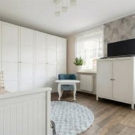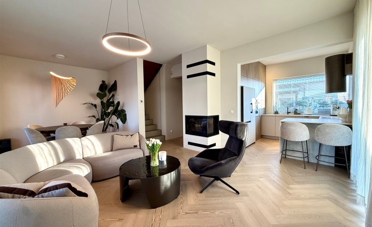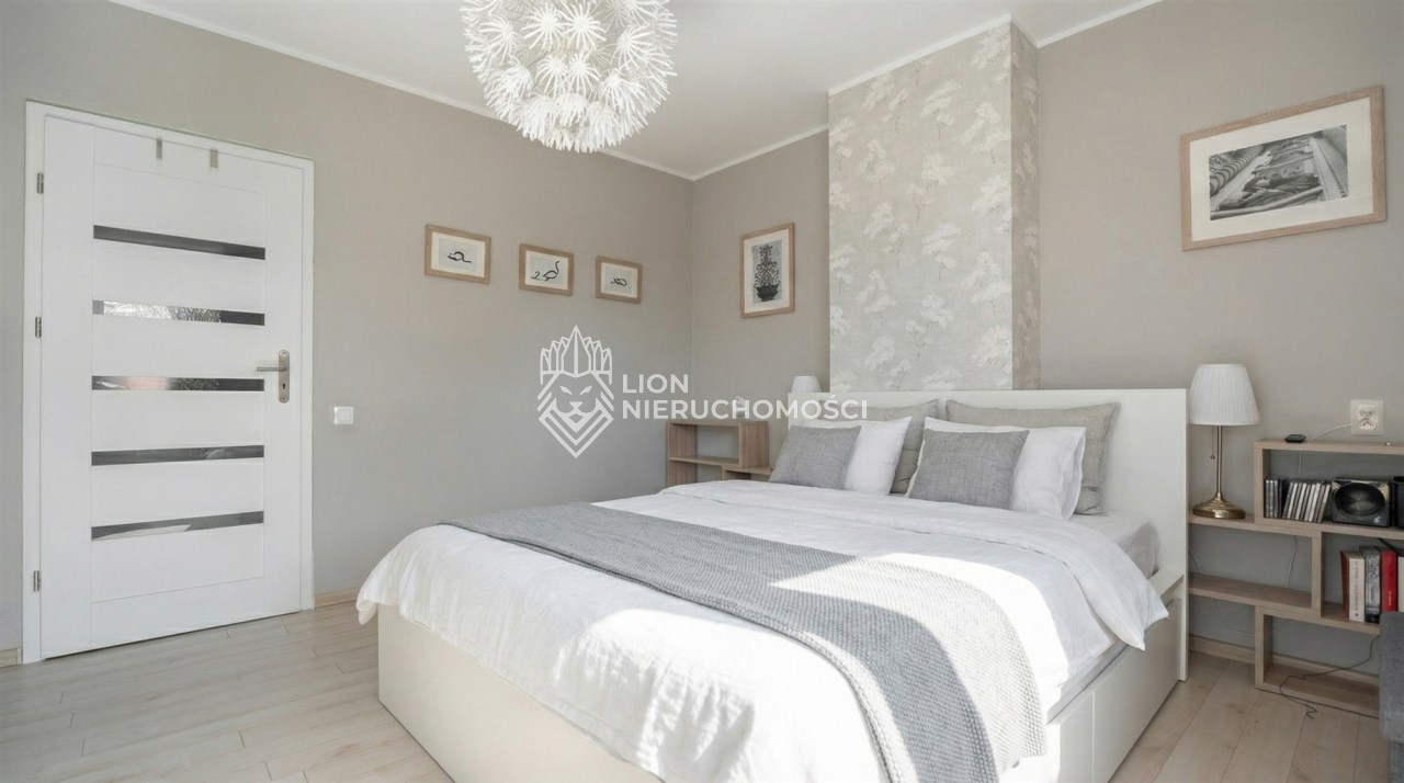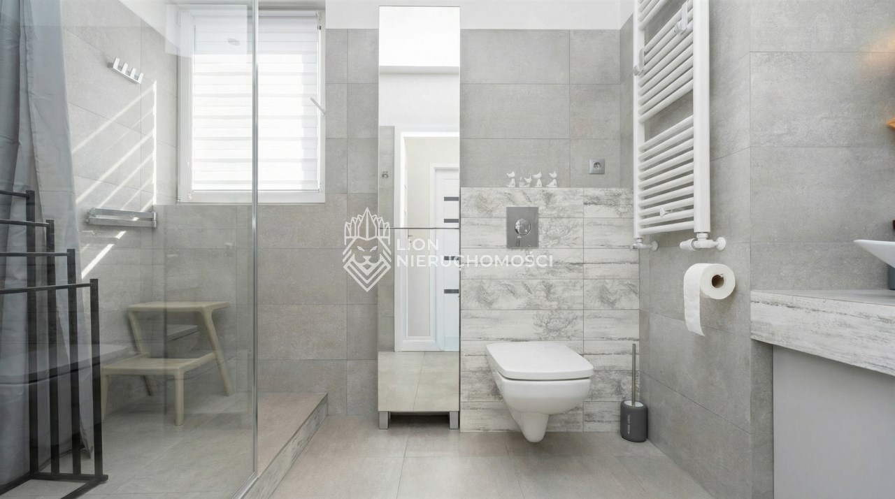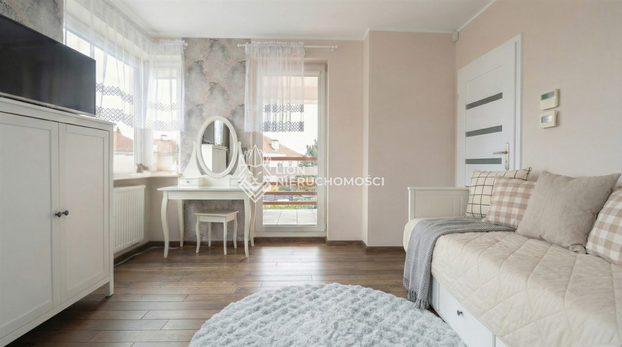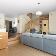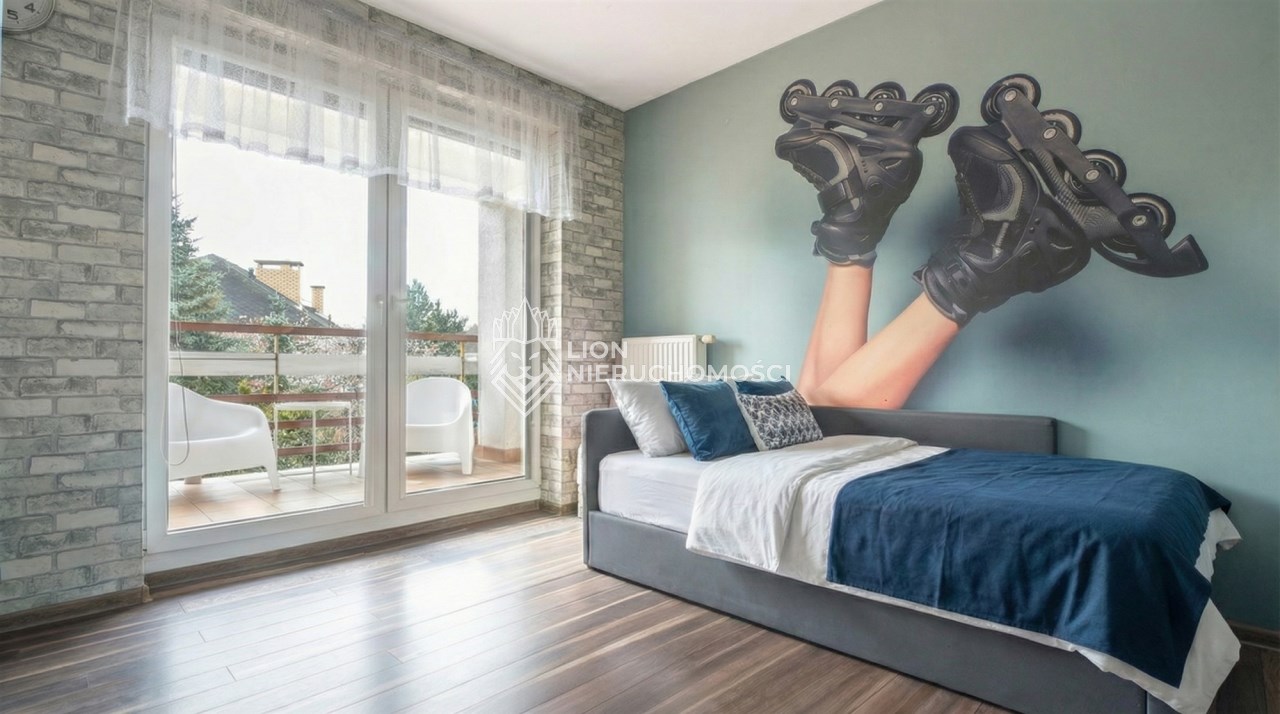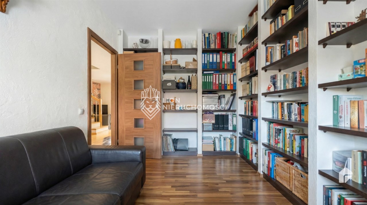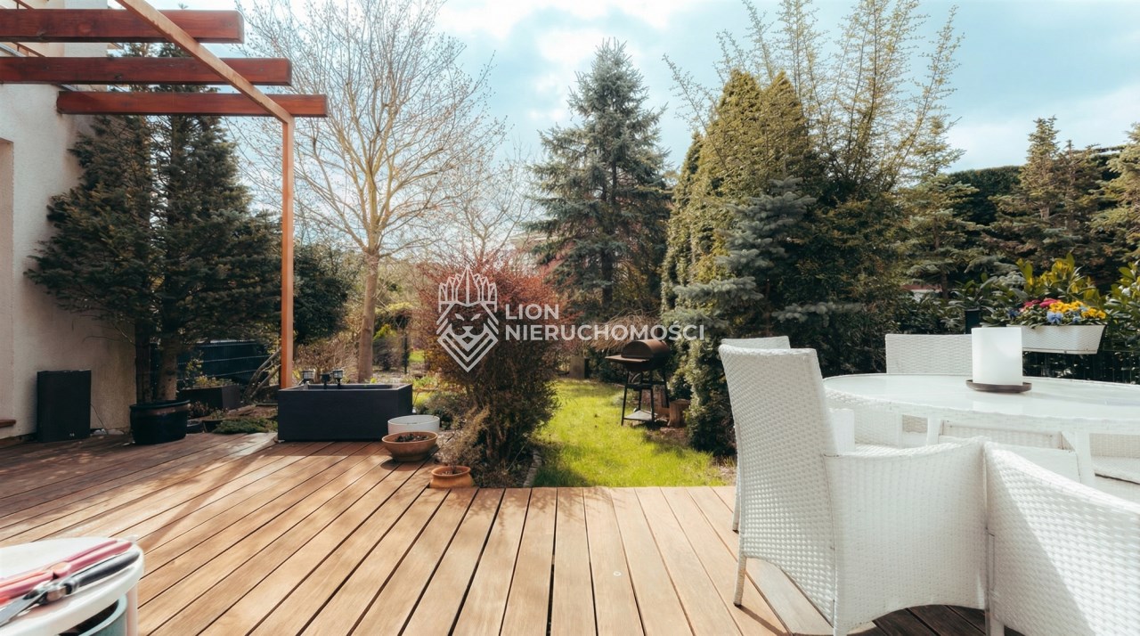 Parter to duży salon z otwartą kuchnia, podzielony na dwie strefy. Strefę kuchenno -jadalnianą i wypoczynkową. Kuchnia z oknem w jasnej zabudowie , w jadalni duży stół z krzesłami. Strefa wypoczynkowa z panoramicznymi przesuwnymi oknami skąd jest wyjście na duży taras i słoneczny ogród. W salonie właściciele , zamiast kominka wstawili piec kaflowy. Na tym poziomie znajduje się pokój (gabinet ) o powierzchni ponad 12 m kw oraz toaleta. Tu też znajdują się schody prowadzące na piętro pierwsze oraz na poziom -1. Piętro pierwsze to trzy sypialnie, garderoba oraz łazienka z oknem i z dużym prysznicem Dzięki usytuowaniu okien, pokoje są dobrze doświetlone a zarazem bardzo ustawne. W dwóch sypialniach balkony. Nad piętrem jest poddasze służące do przechowywania. Poziom -1 to duży garaż o powierzchni ponad 25 m oraz dwa dodatkowe pomieszczenia spełniające funkcje pralni i piwnicy.