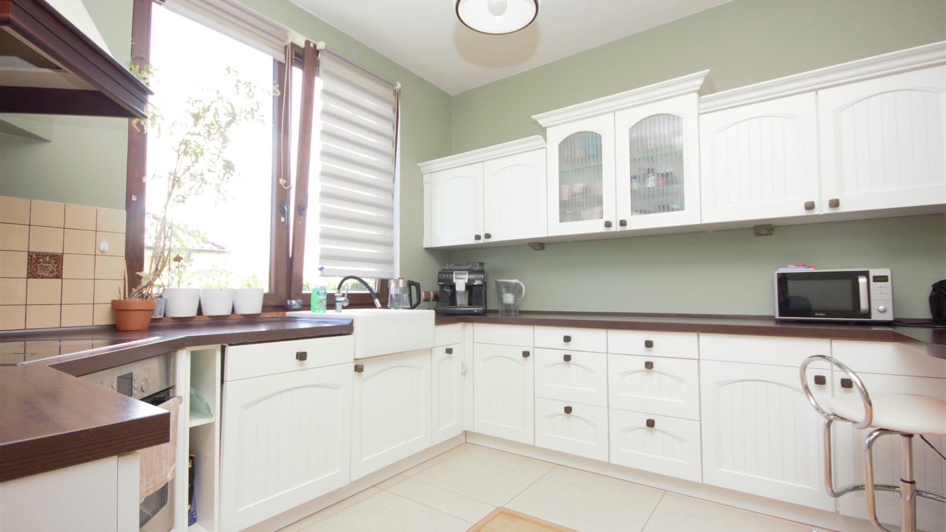Na oknach w parterze rolety elektryczne. Kuchnia umeblowana i wyposażona  w sprzęt AGD -nowa zmywarka .Na podłogach panele. ściany gładzie.