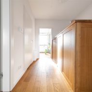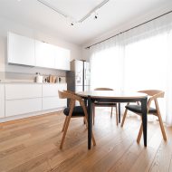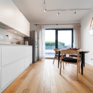 podłogi z drewna dębowego, drewniane drzwi oraz zabudowy stolarskie.