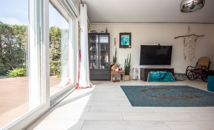 Z salonu jest wyjście na taras przez duże, przeszklone oraz przesuwne drzwi tarasowe.
