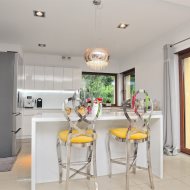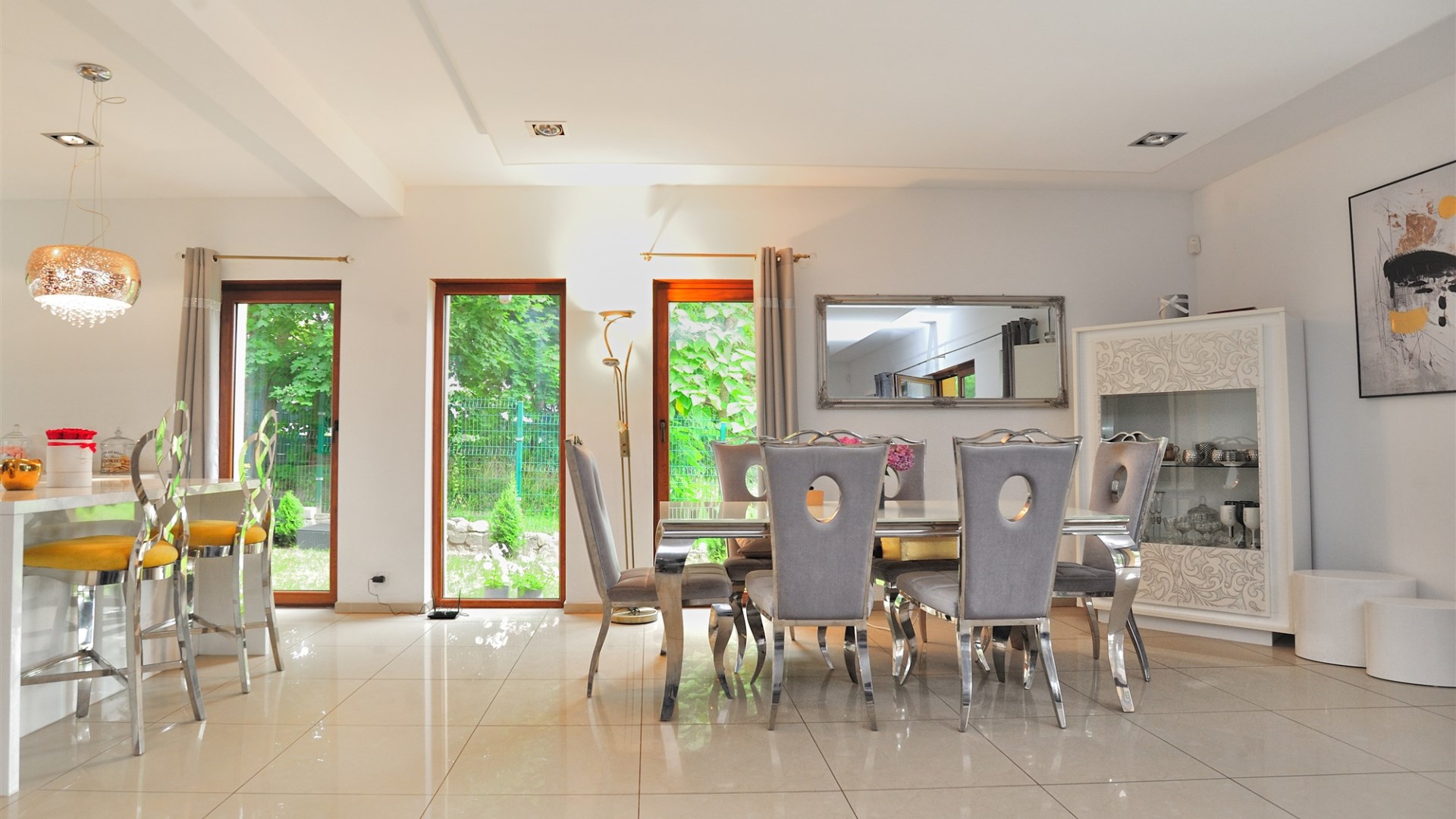 Przestronny, jasny salon z wyjściem na zadaszony taras od strony południowej