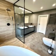 - duża łazienka z toaletą i oknem (wanna, natrysk, dwa zlewy, zabudowa na wymiar - pierwotnie pokój) - 11,5m2