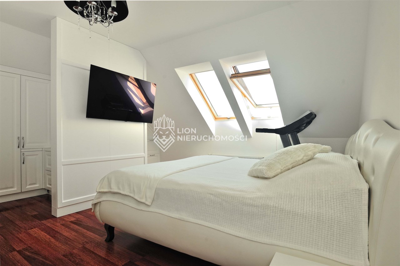 Na piętro prowadzą odrestaurowane w 2024 roku drewniane kręcone schody. Piętro o powierzchni użytkowej 73,71m2, całkowitej 104,56m2 gdzie znajdują się:4 sypialnie z czego jedna z własną łazienką i garderobą, łazienka, garderoba oraz przedpokój