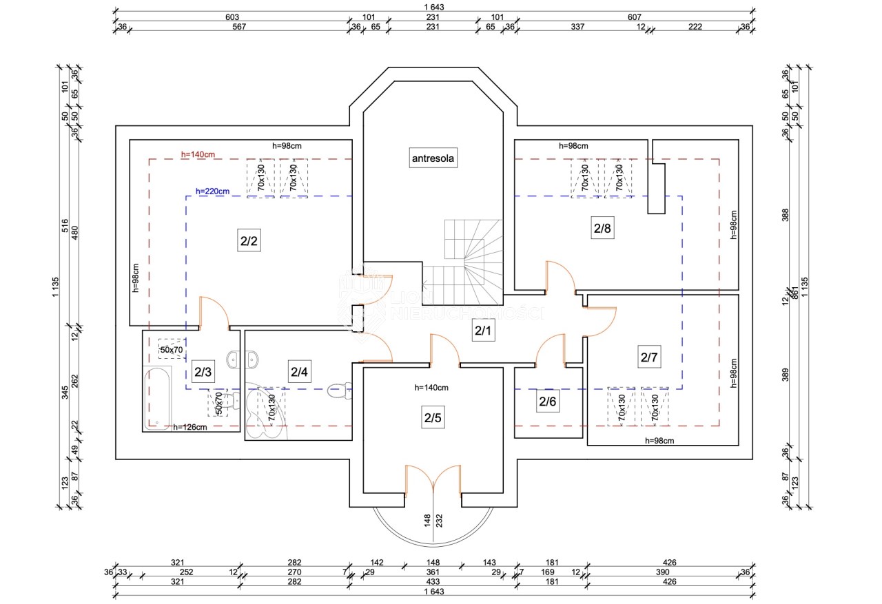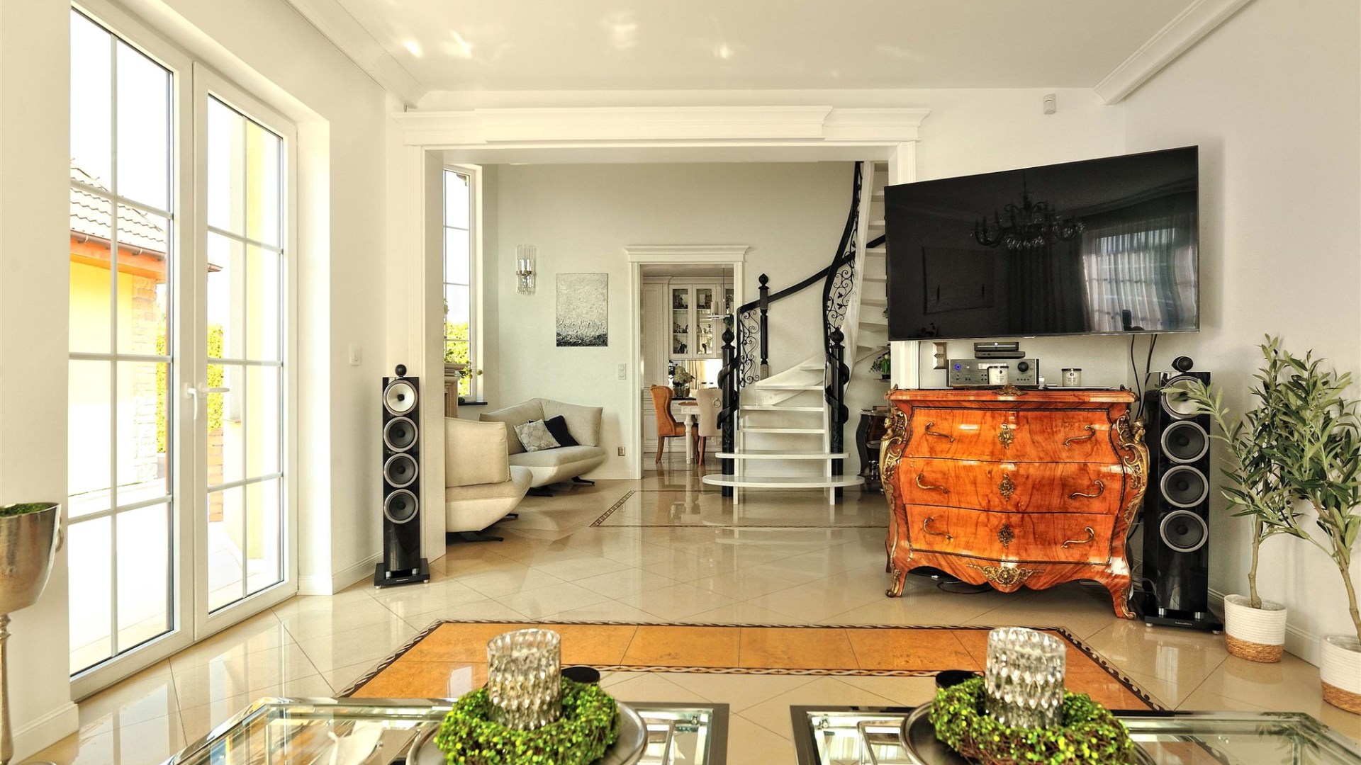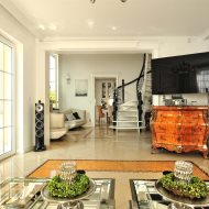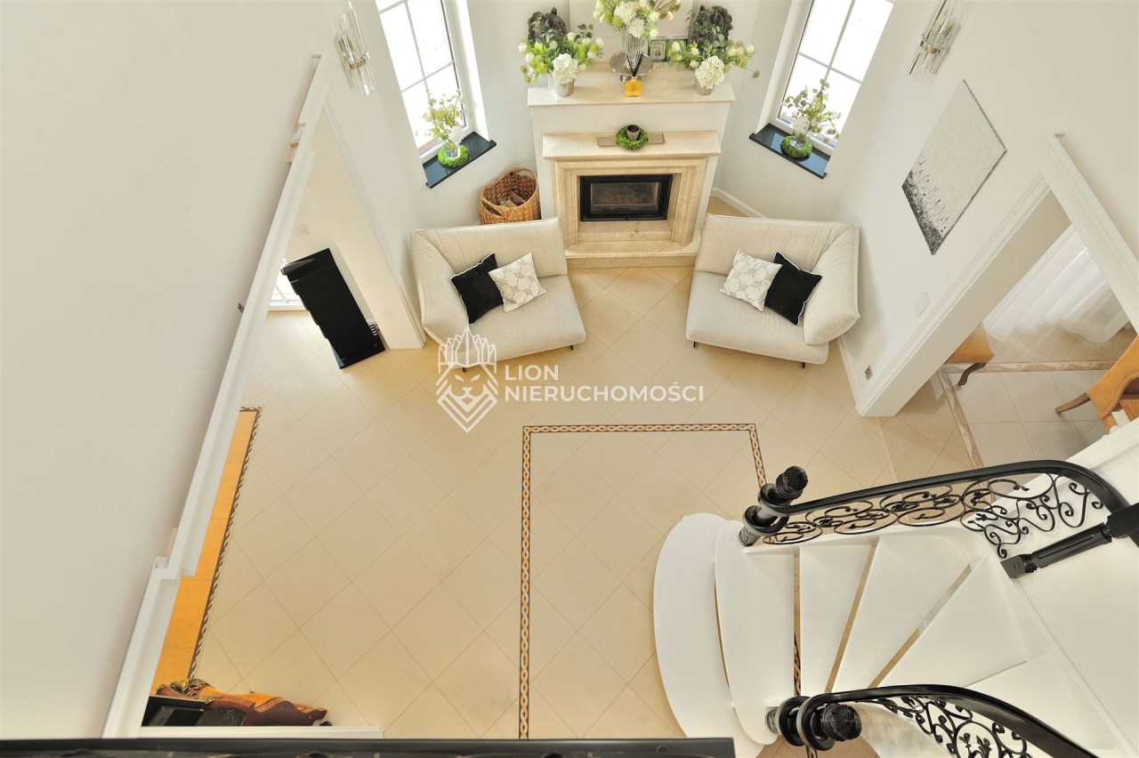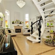 • reprezentacyjny hol – wysokość 7 metrów, marmurowy kominek i eleganckie, kręcone schody