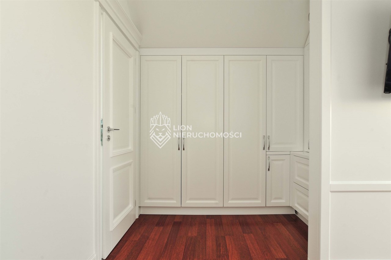 Na piętro prowadzą odrestaurowane w 2024 roku drewniane kręcone schody. Piętro o powierzchni użytkowej 73,71m2, całkowitej 104,56m2 gdzie znajdują się:4 sypialnie z czego jedna z własną łazienką i garderobą, łazienka, garderoba oraz przedpokój
