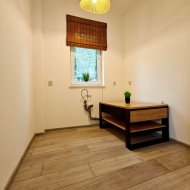 nowo wyremontowana łazienka z wanną (bojler elektryczny, miejsce na pralkę, grzejnik).