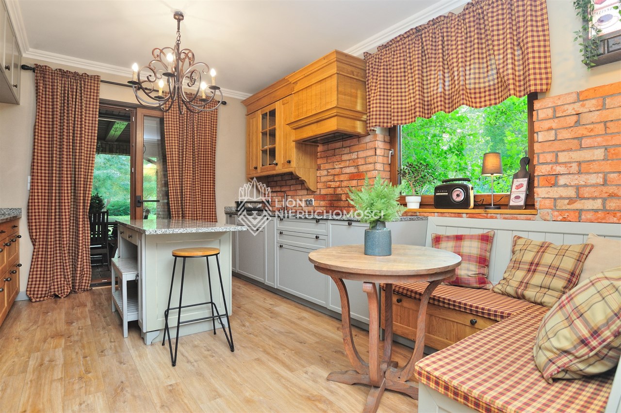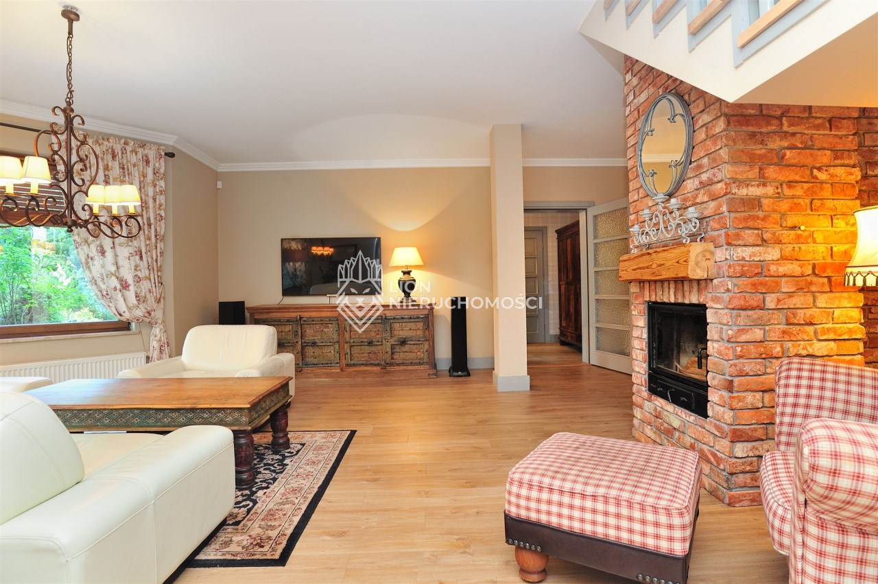 Wnętrza zostały zaprojektowane z myślą o wygodzie domowników. Przestronny, jasny salon z kominkiem stanowi centrum życia rodzinnego. Z salonu prowadzi wyjście na taras i do ogrodu, co sprzyja odpoczynkowi na świeżym powietrzu.