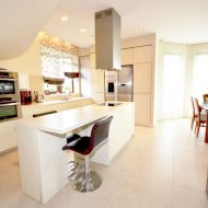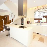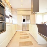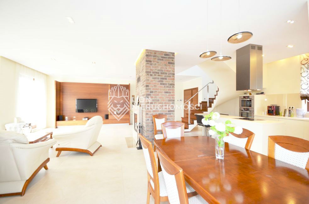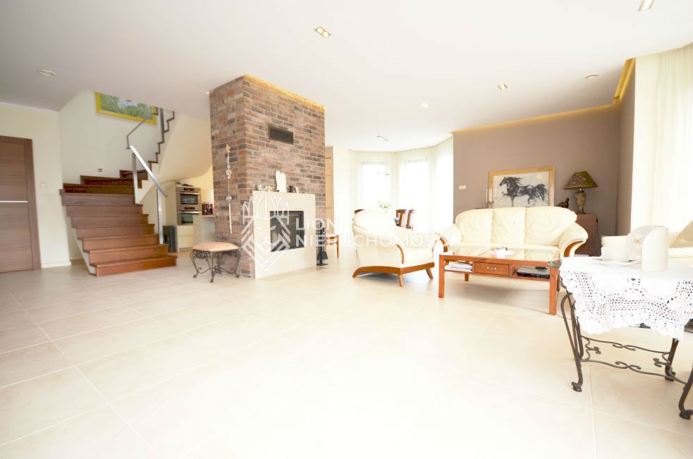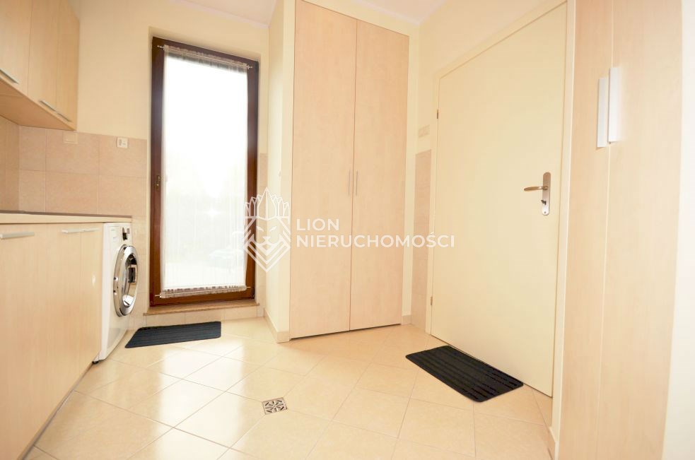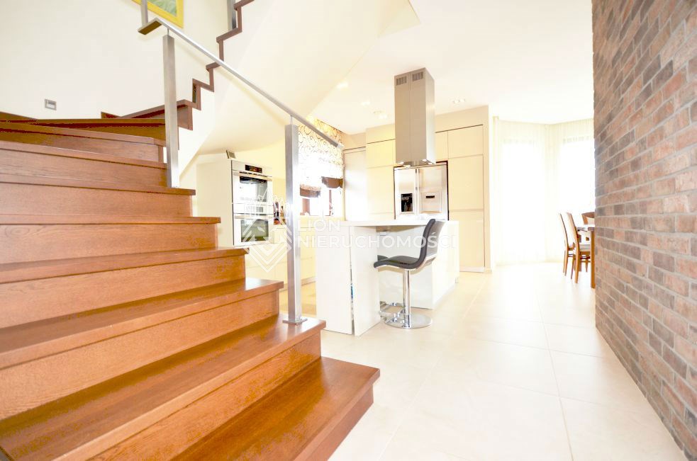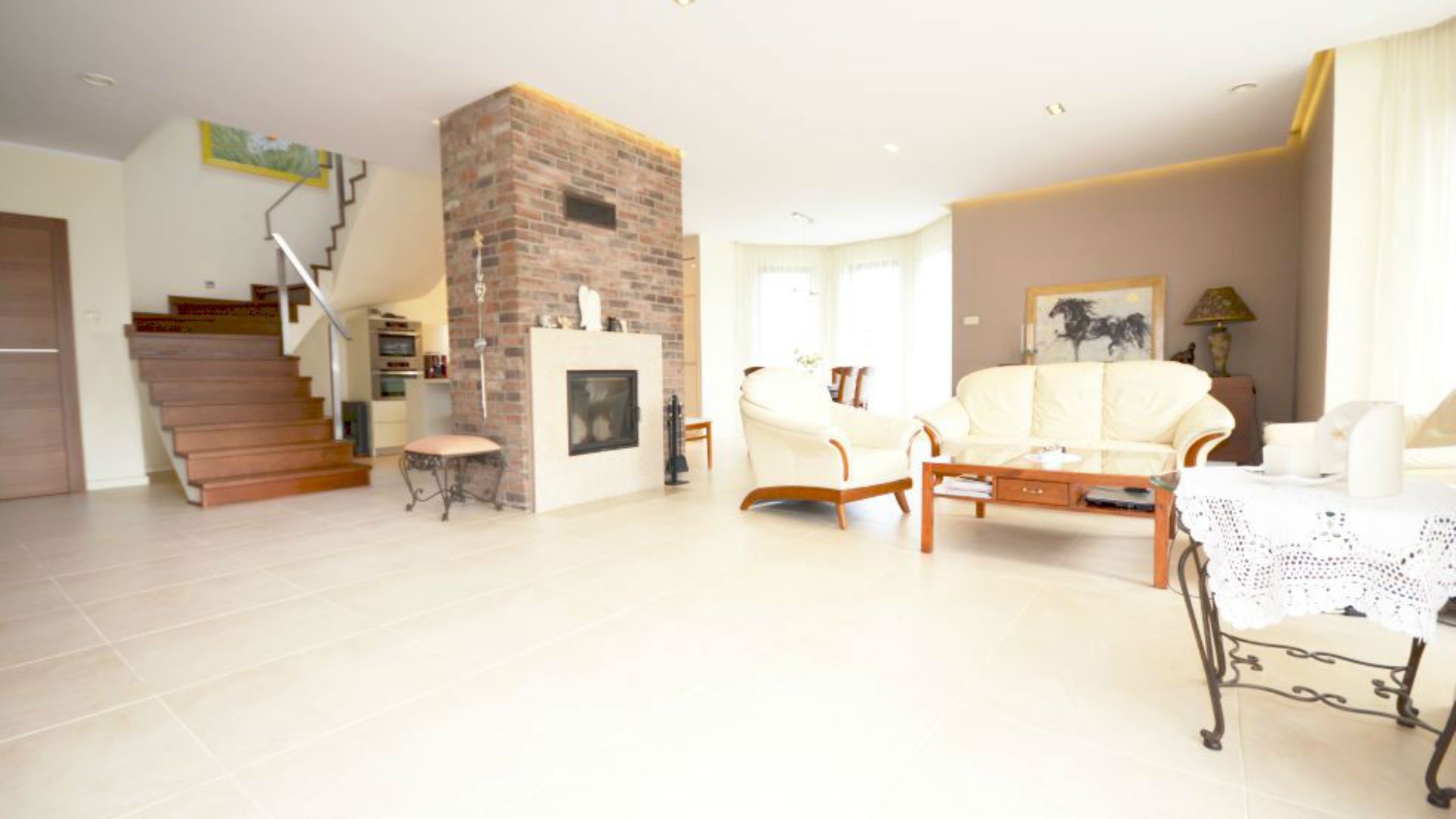 Parter: przestronny salon z jadalnią i otwartą kuchnią w markowej zabudowie (wyposażonej w markowy sprzęt AGD - całość 70m2, łazienki z prysznicem - deszczownica razem z toaletą, garderoby, pomieszczenia gospodarczego z pralnią razem z kotłownią - przejście do garażu dwustanowiskowego (brama automatyczna), przedpokoju oraz hollu.