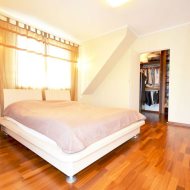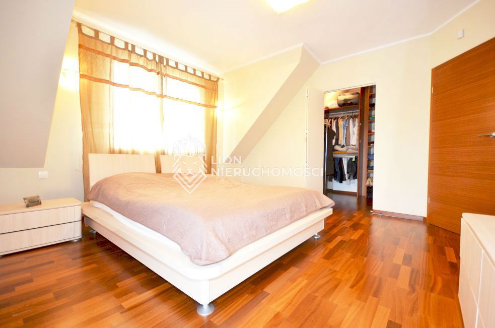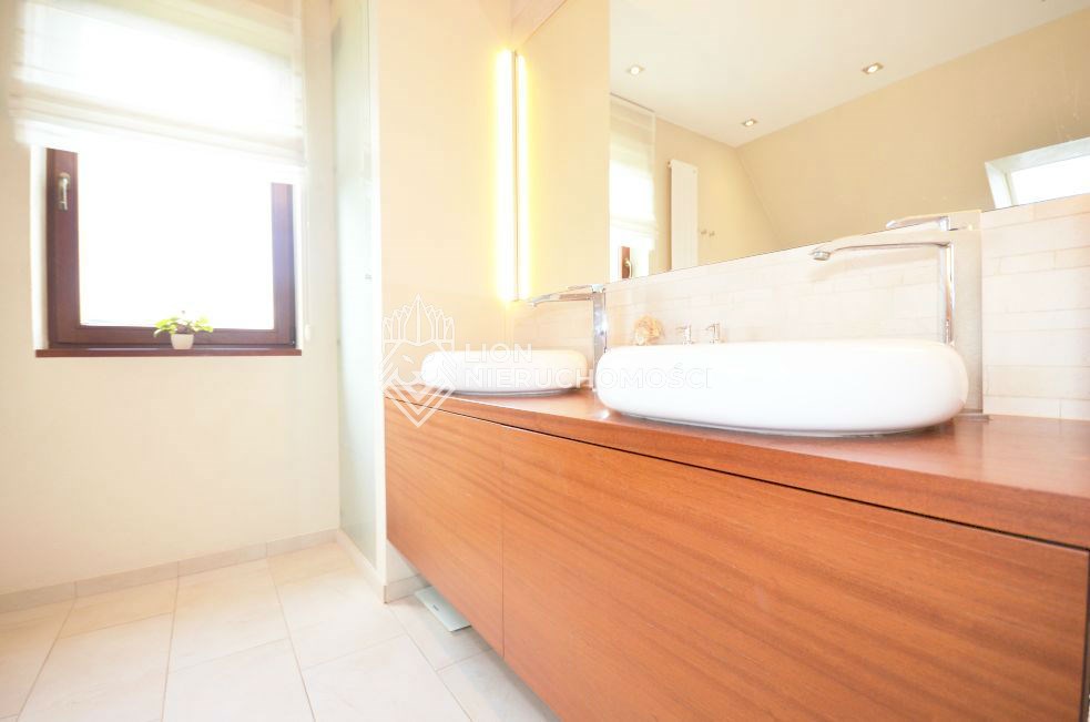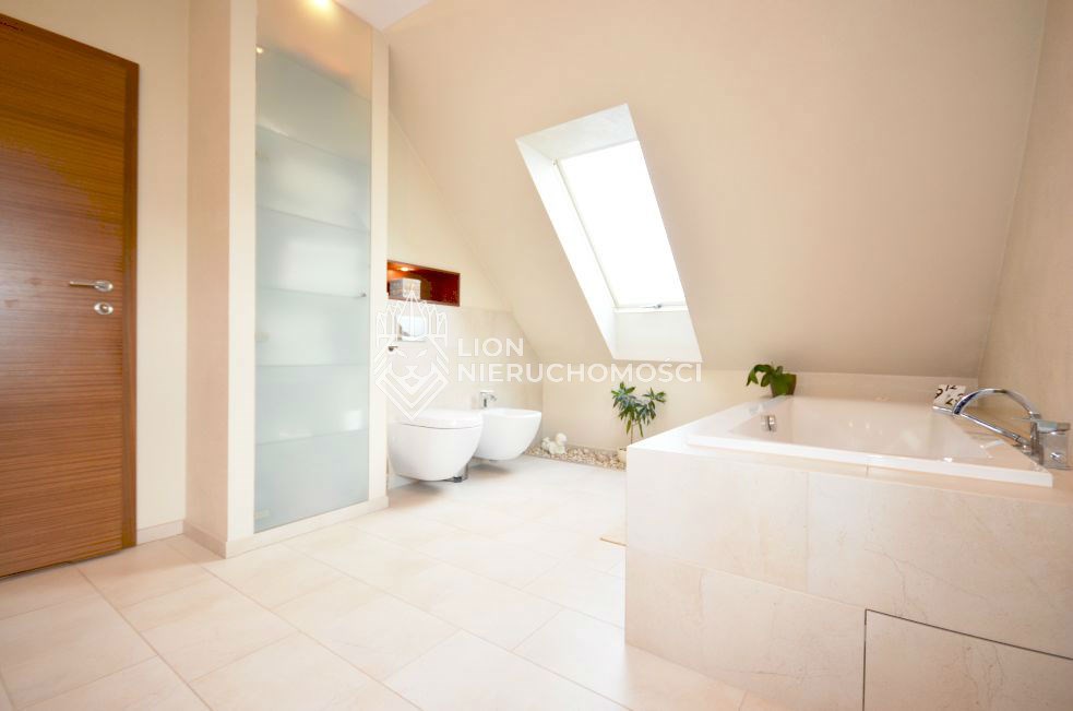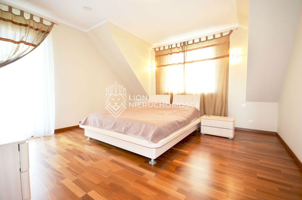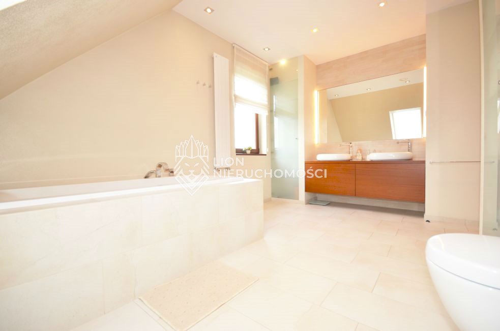 Piętro: cztery pokoje/sypialnią: pierwsza sypialnia z wyjściem na balkon - ok. 17m2, garderobą; druga z antresolą i garderobą - 27m2, trzecia sypialnia z przejściowa do czwartej z własną garderobą - całość 35m2, główna łazienka z wanną, dwoma zlewami, kilkoma zabudowami na ręczniki - ok. 11m2, przedpokój. Nieruchomość wykończona w bardzo nowoczesny sposób, przy zastosowaniu wysokiej klasy materiałów.