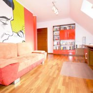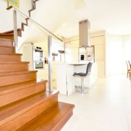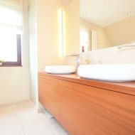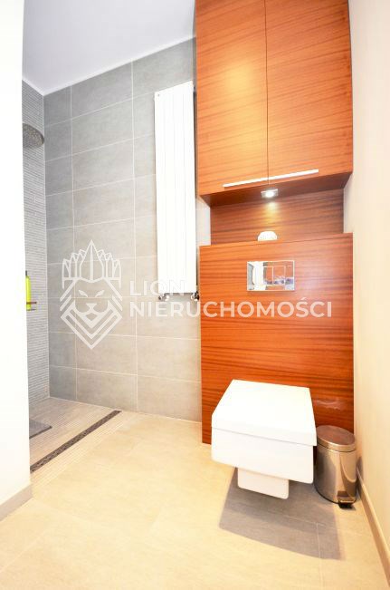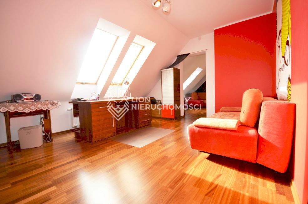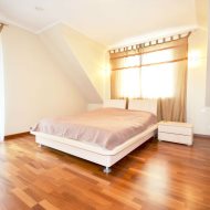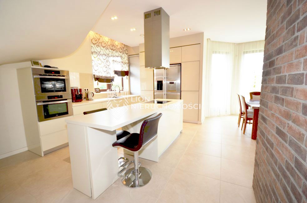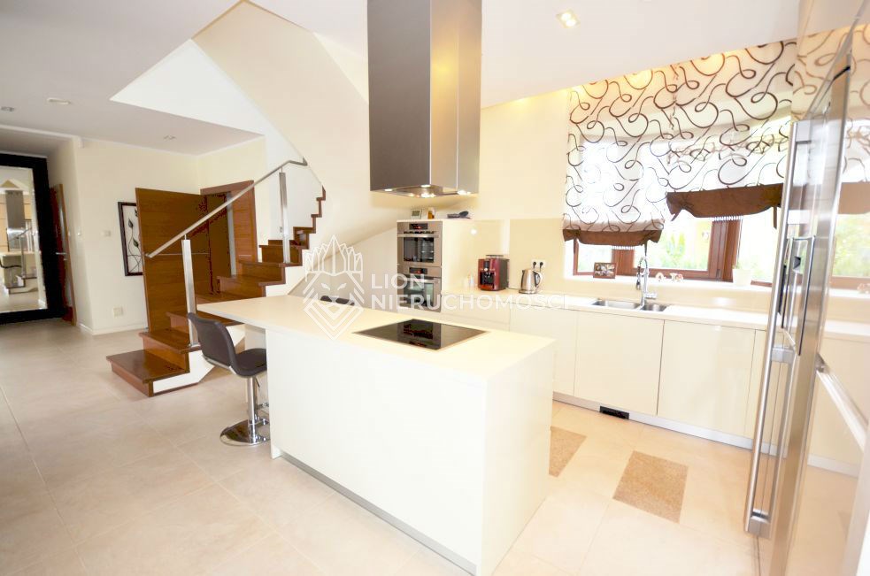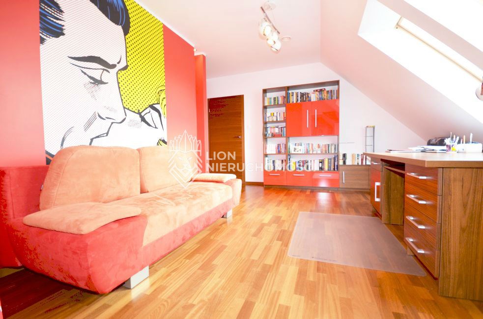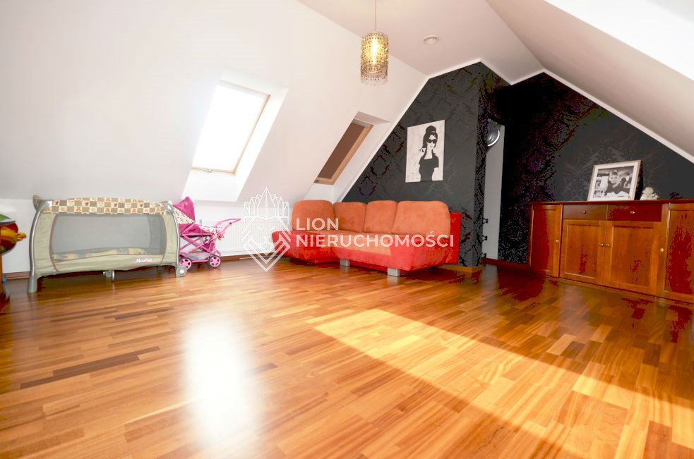 Piętro: cztery pokoje/sypialnią: pierwsza sypialnia z wyjściem na balkon - ok. 17m2, garderobą; druga z antresolą i garderobą - 27m2, trzecia sypialnia z przejściowa do czwartej z własną garderobą - całość 35m2, główna łazienka z wanną, dwoma zlewami, kilkoma zabudowami na ręczniki - ok. 11m2, przedpokój. Nieruchomość wykończona w bardzo nowoczesny sposób, przy zastosowaniu wysokiej klasy materiałów.