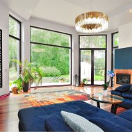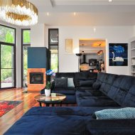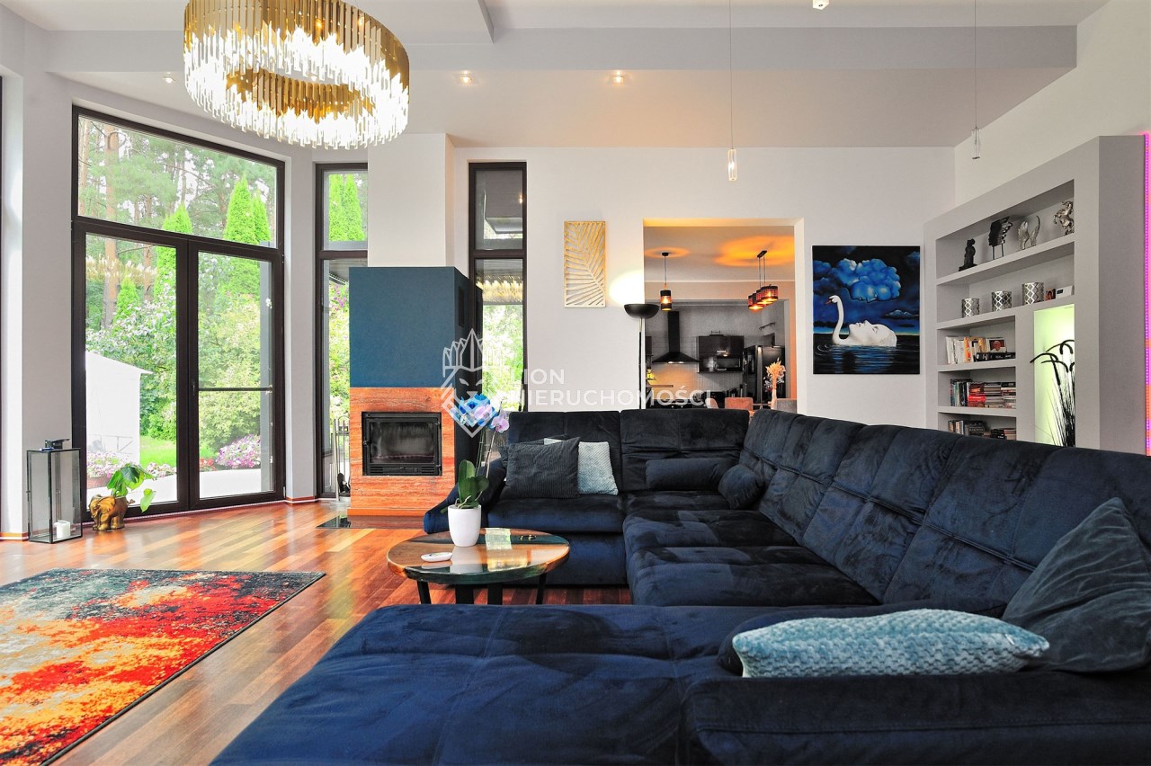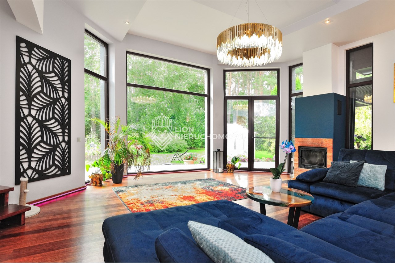 przestronny salon z dużymi przeszkleniami i widokiem na ogród (ok. 40 m²),