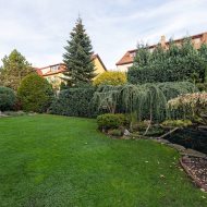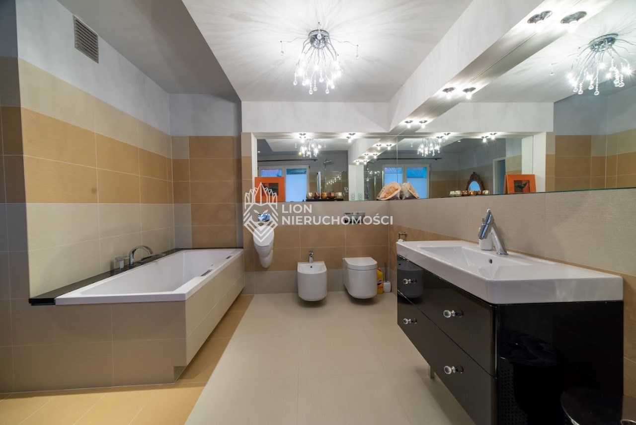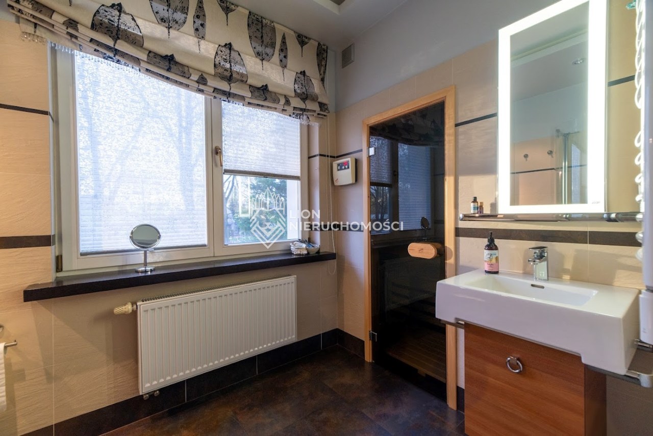 Nieruchomość usytuowana jest frontem do parku, na przepięknie zagospodarowanej działce o powierzchni 716 m² z oczkiem wodnym zarybionym, licznymi nasadzeniami i idealnie utrzymanym trawnikiem wyposażonym w automatyczny system nawadniania i robota koszącego.