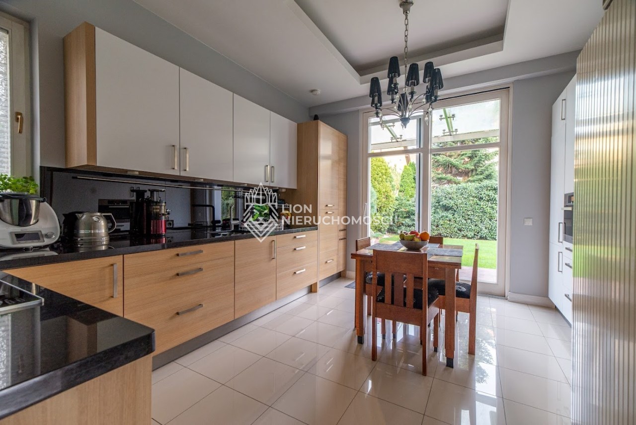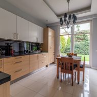 Z kuchni i jadalni można wyjść bezpośrednio na taras z widokiem na ogród — idealne miejsce na poranną kawę lub spotkania z bliskimi.