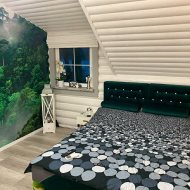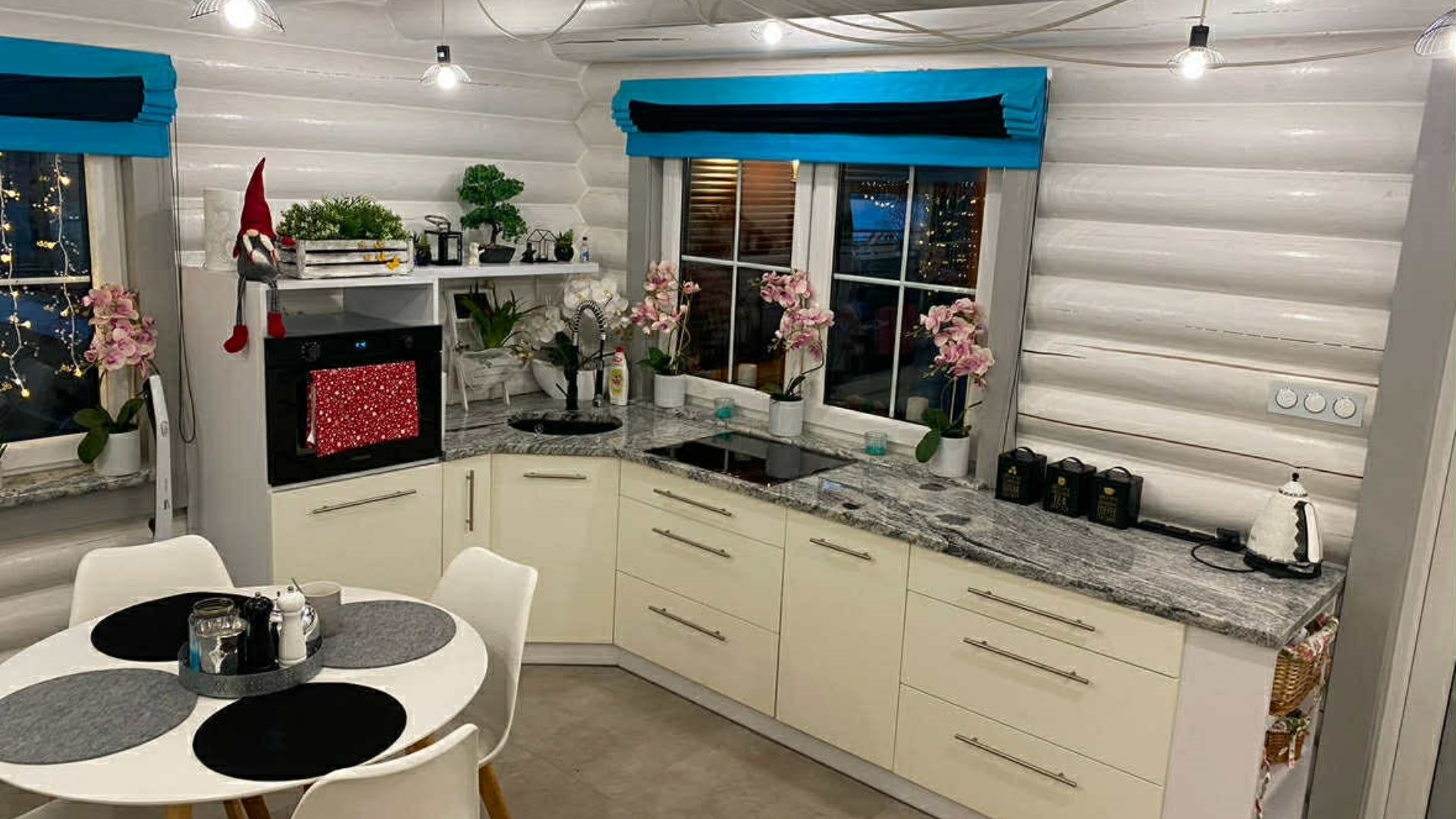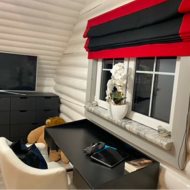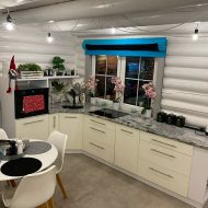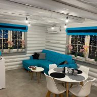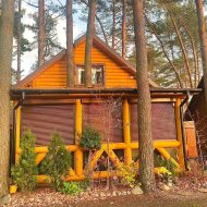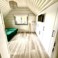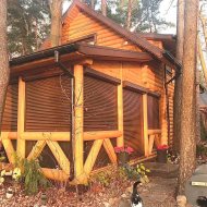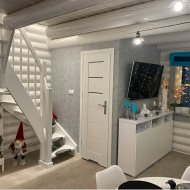 Dom wykonany z naturalnego bala drewnianego tworzy niepowtarzalny klimat – ciepły, przytulny i harmonijnie wpisujący się w otoczenie lasów i jeziora. Duże przeszklenia zapewniają doskonałe doświetlenie wnętrza i widok na zieleń.