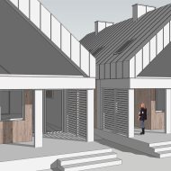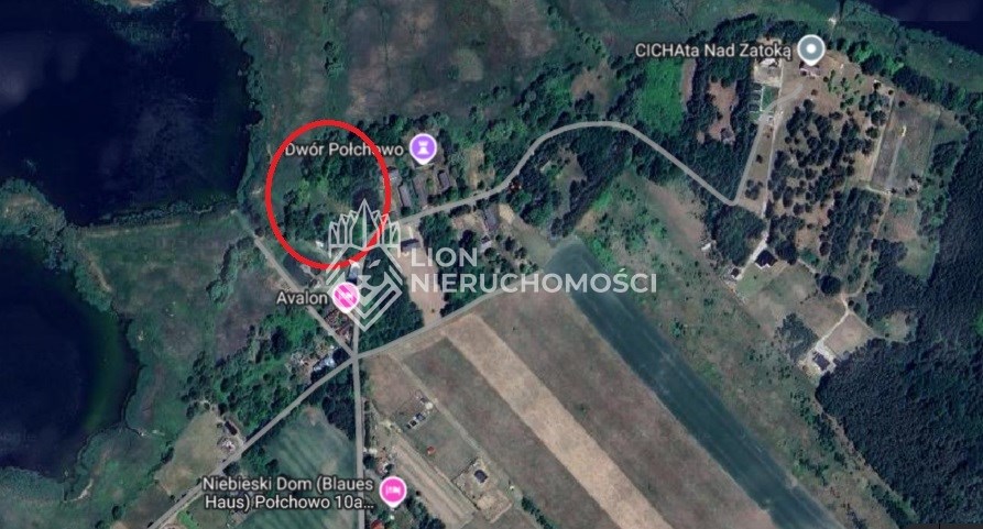 W sąsiedztwie pensjonat, zabudowania starsze wsi Połchowo oraz nowo powstające domy i budynki rekreacyjne.