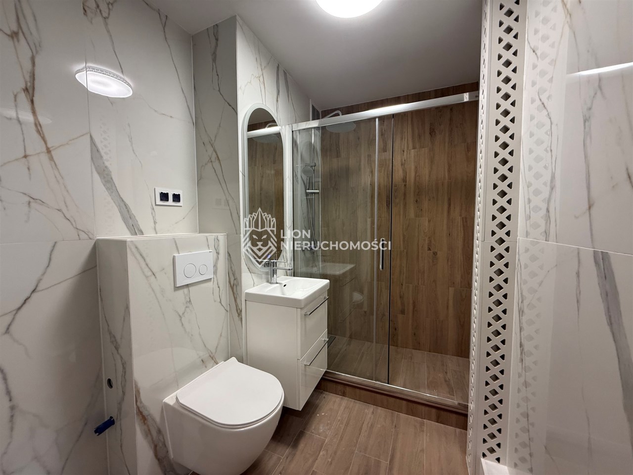 łazienka po remoncie, wyposażona w kabinę prysznicową