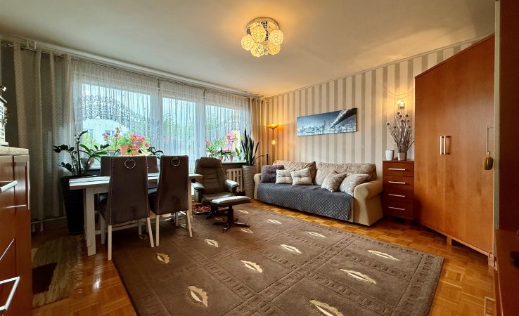 Mieszkanie znajduję się na parterze i ma 59m2 powierzchni całkowitej w skład której wchodzą dwa duże pokoje po 19m2, osobna kuchnia wraz z spiżarnia 11m2, przedpokój 5,5m2, łazienka 5m2 z wc.