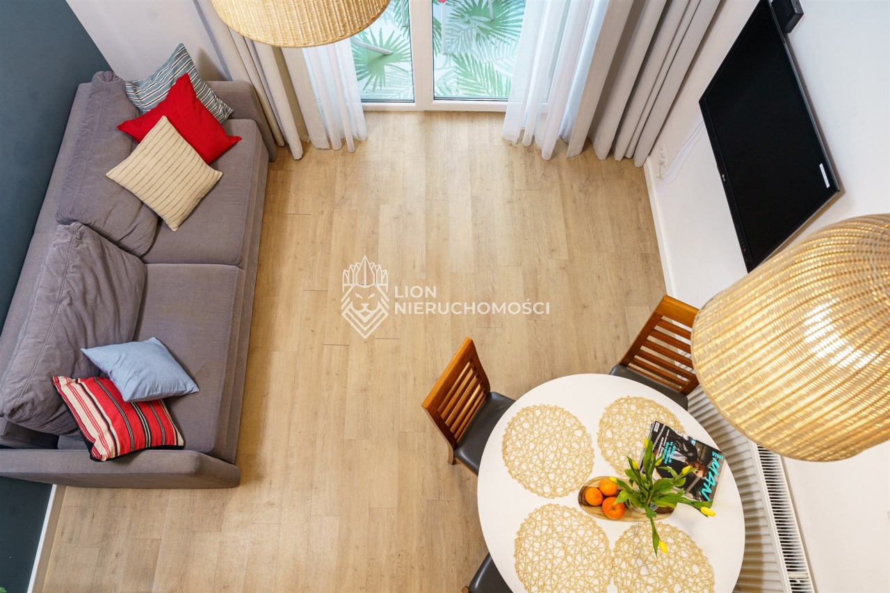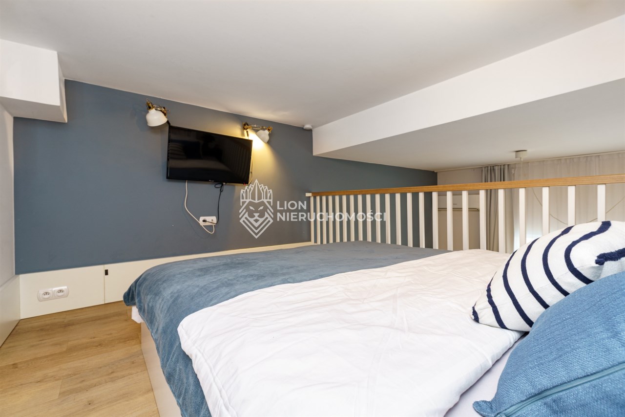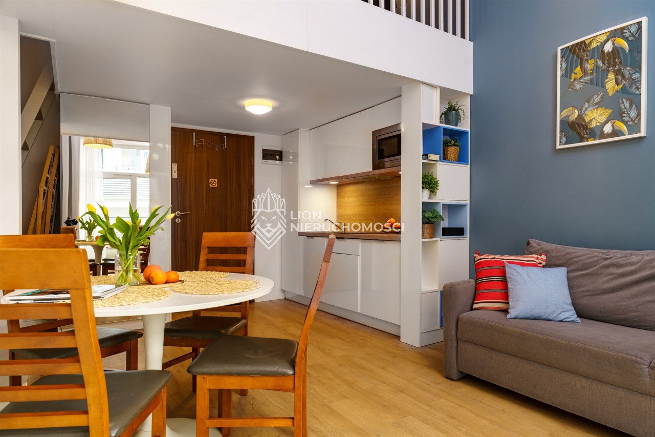 Funkcjonalne studio z antresolą zostało zaprojektowane z myślą o maksymalnym komforcie gości. Na antresoli znajduje się dwuosobowe łóżko oraz telewizor, natomiast w części dziennej – rozkładana sofa, stół z krzesłami oraz drugi telewizor. Lokal pomieści 4 osoby, co znacząco zwiększa jego potencjał najmu. Do dyspozycji jest również w pełni wyposażony aneks kuchenny (lodówka, płyta kuchenna, pochłaniacz i kuchenka mikrofalowa). Całość uzupełnia balkon z bocznym widokiem na morze.