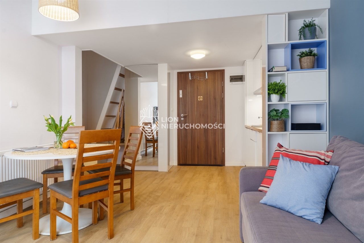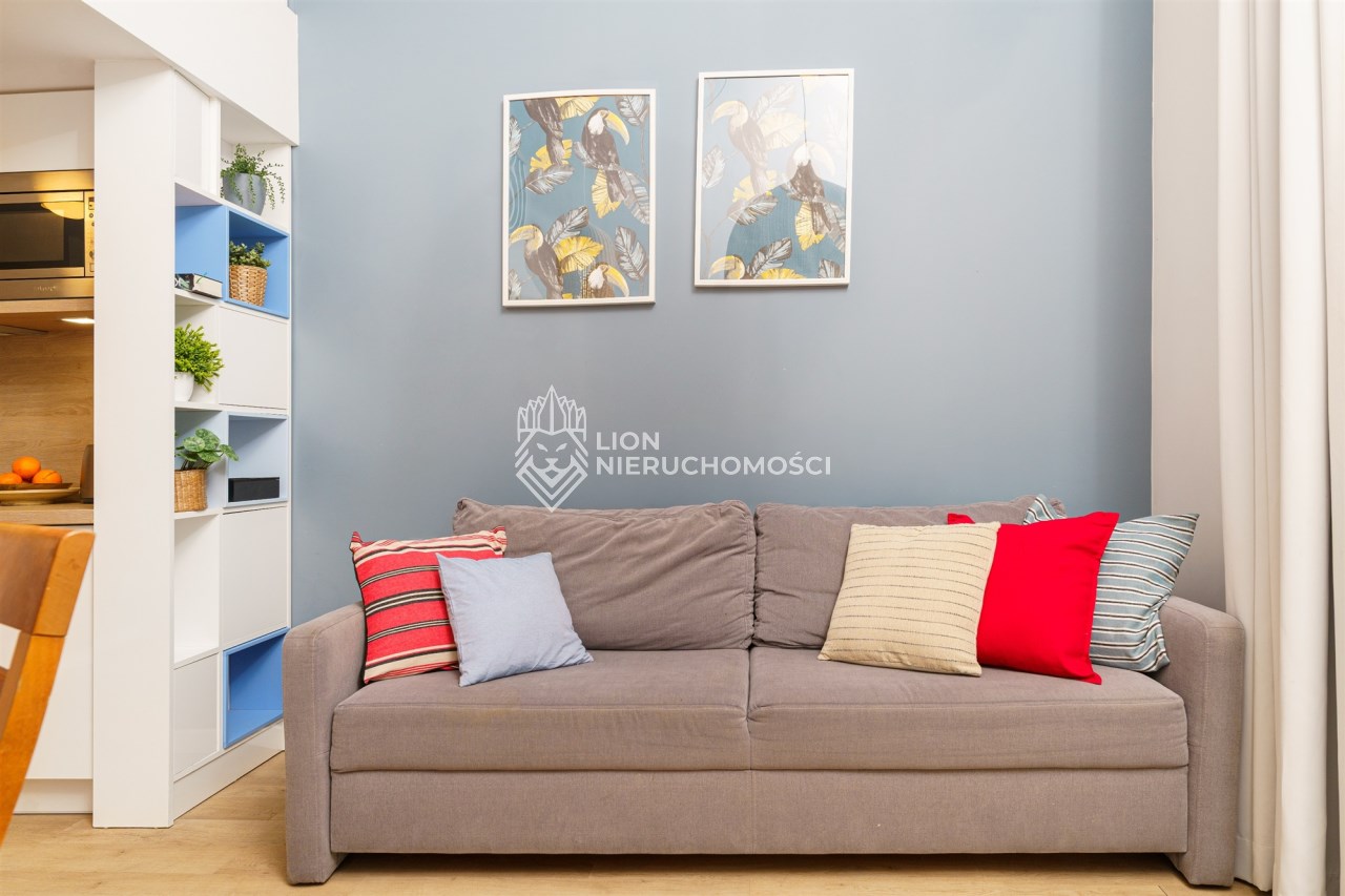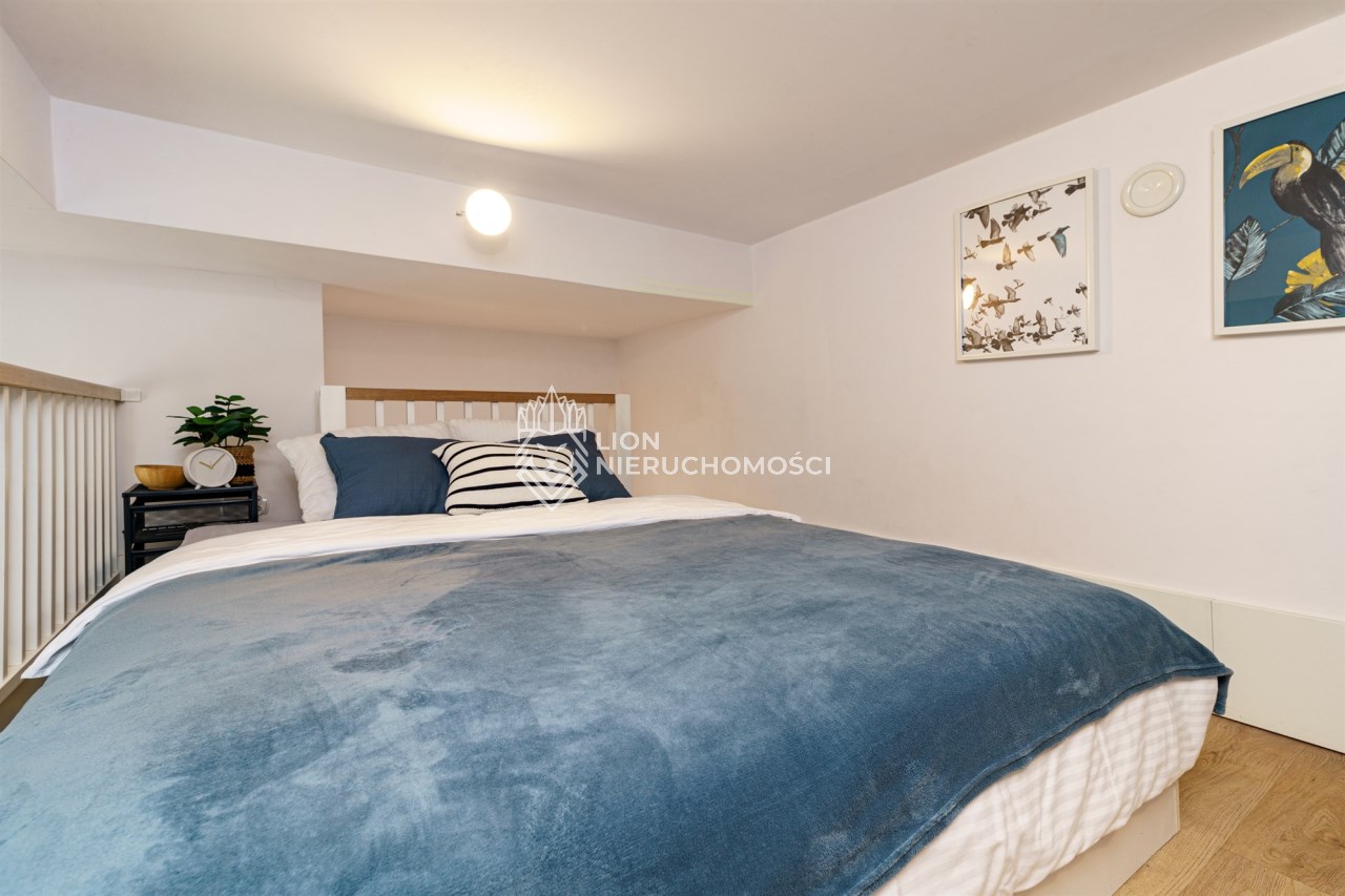 Funkcjonalne studio z antresolą zostało zaprojektowane z myślą o maksymalnym komforcie gości. Na antresoli znajduje się dwuosobowe łóżko oraz telewizor, natomiast w części dziennej – rozkładana sofa, stół z krzesłami oraz drugi telewizor. Lokal pomieści 4 osoby, co znacząco zwiększa jego potencjał najmu. Do dyspozycji jest również w pełni wyposażony aneks kuchenny (lodówka, płyta kuchenna, pochłaniacz i kuchenka mikrofalowa). Całość uzupełnia balkon z bocznym widokiem na morze.