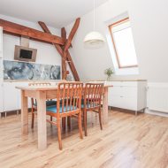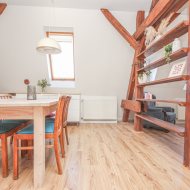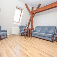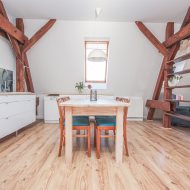 - Przestronny salon z w pełni wyposażonym w sprzęty AGD aneksem kuchennym i jadalnią o powierzchni ponad 27m
