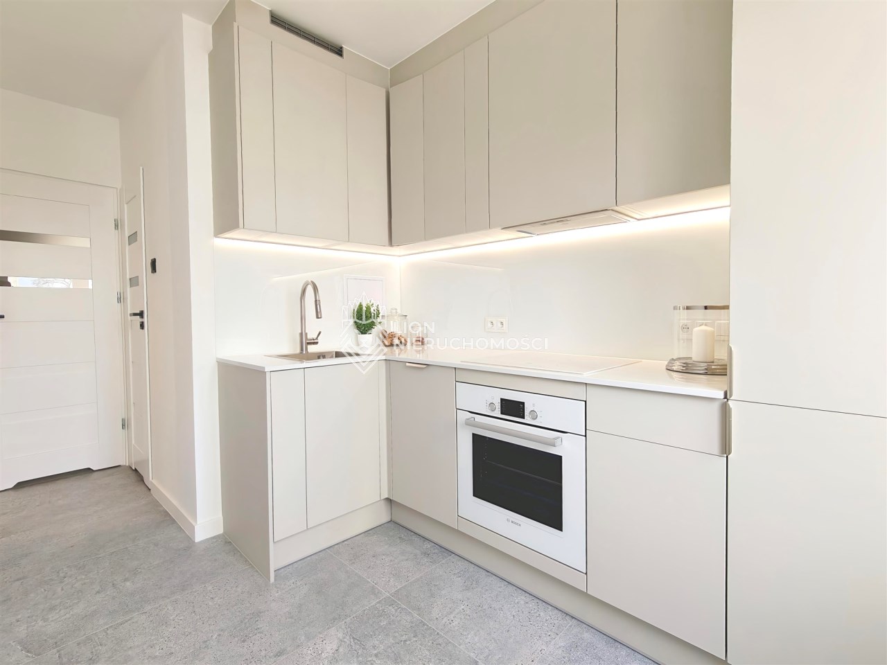 Osobna kuchnia z oknem – wykonana na wymiar przez stolarza, w pełni wyposażona w nowy sprzęt AGD (płyta indukcyjna, piekarnik, lodówka, zmywarka) oraz efektowne podświetlenie LED.