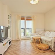 Mieszkanie składa się z przestronnego korytarza (9,34m2), salonu z aneksem kuchennym (23,12m2), sypialni (12,49m2), łazienki z wc (4,23m2). Z salonu jak i sypialni wyjście na taras od strony południowo zachodniej.