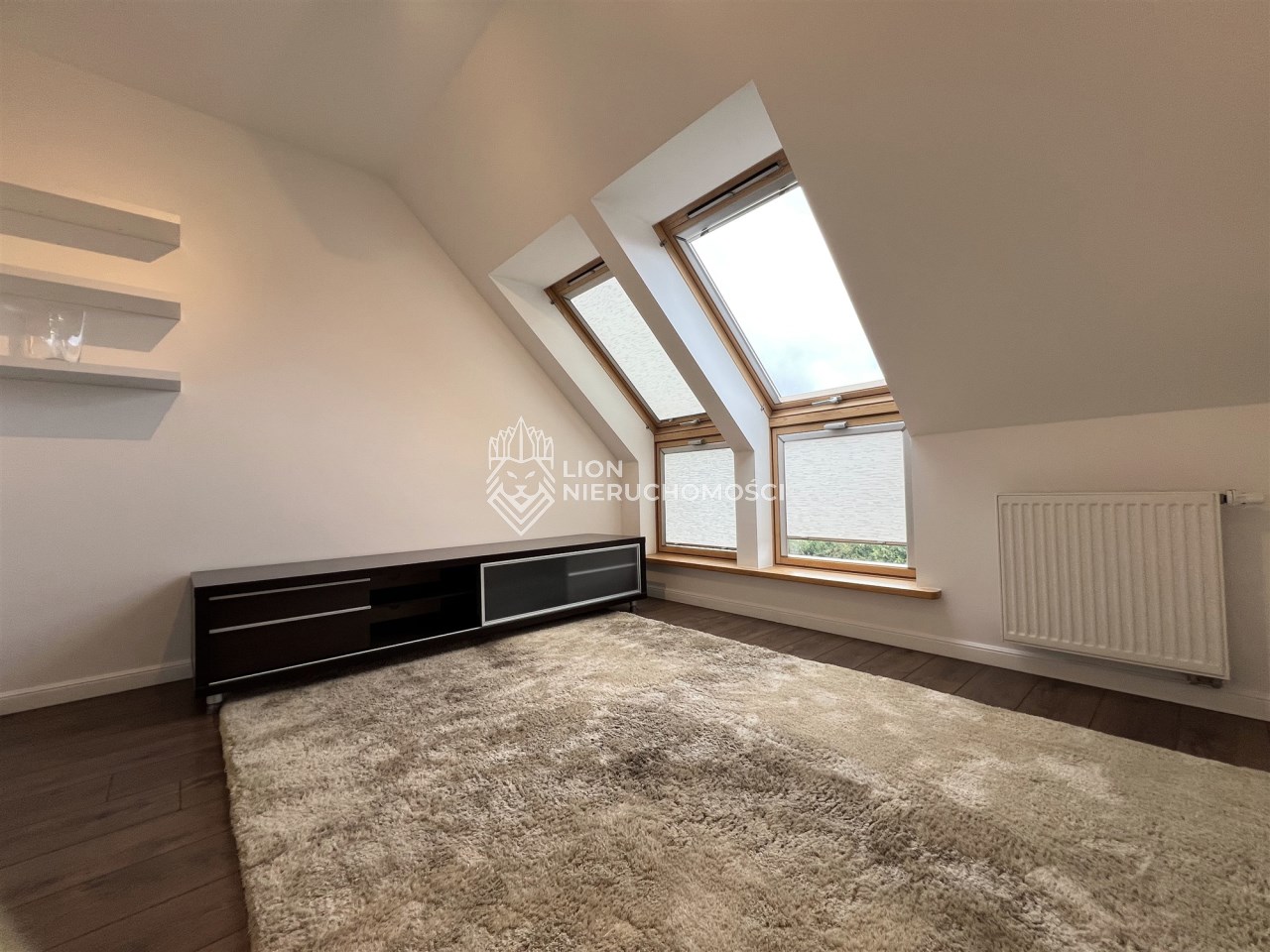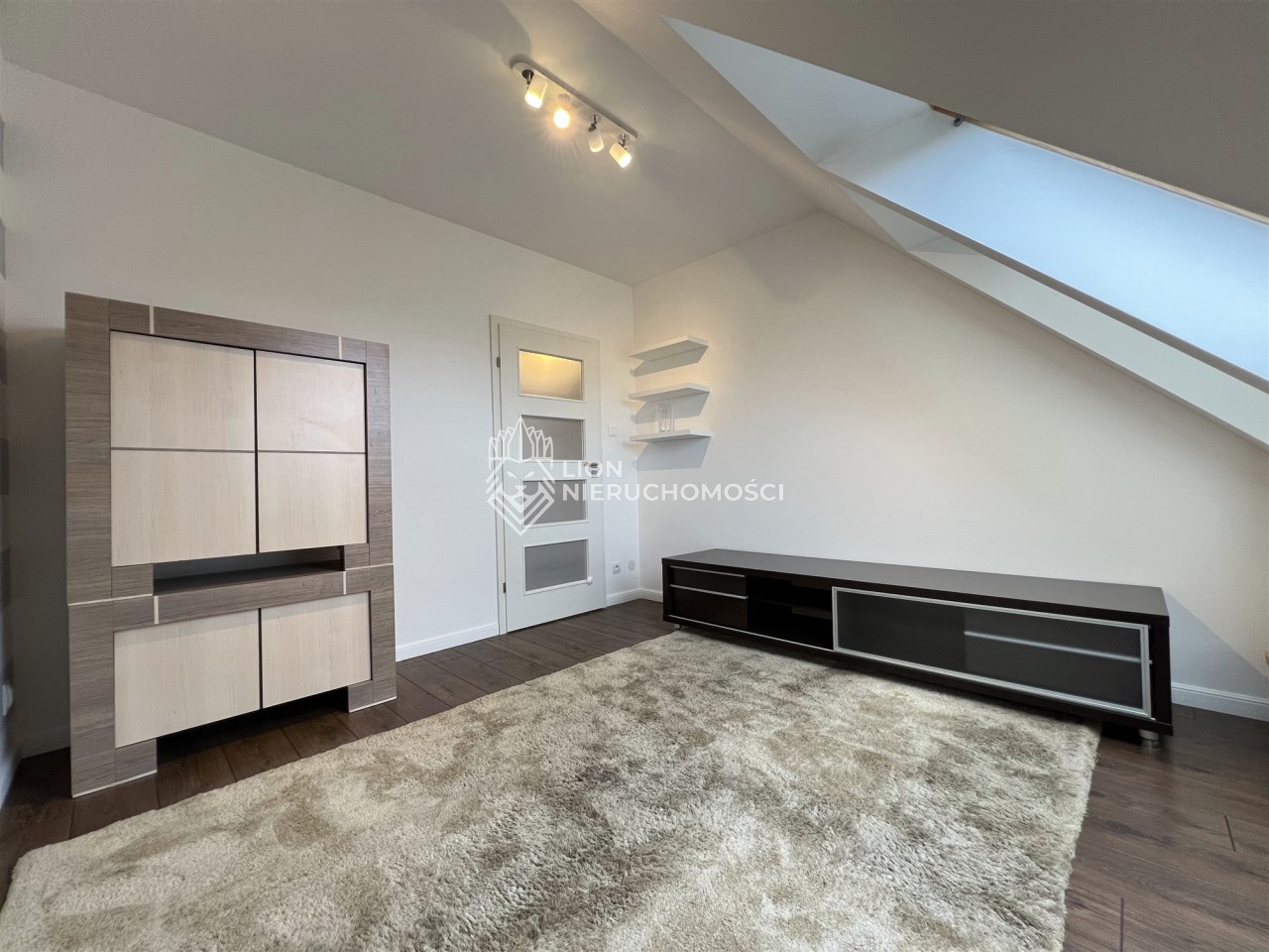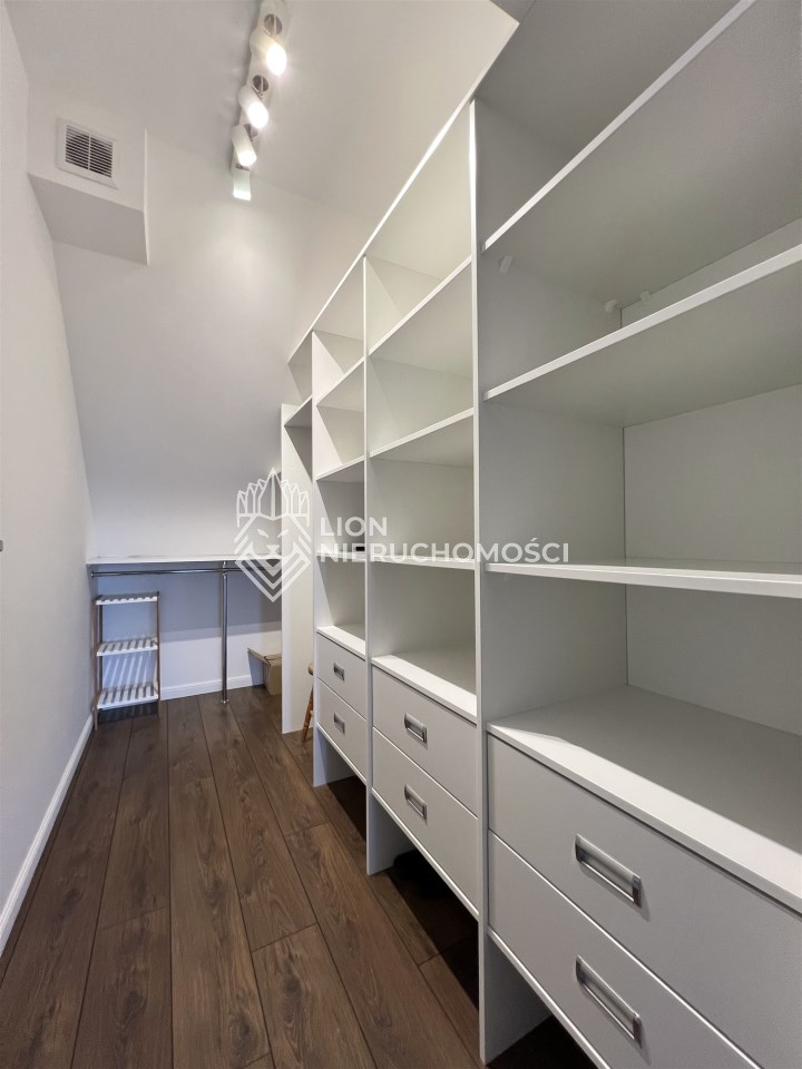 Dolny poziom nieruchomości stanowi przestronny salon z wyjściem na taras (zamontowana markiza) oraz półotwarta kuchnia. Kuchnia wyposażona we wszystkie niezbędne sprzęty. Na tym samym poziomie znajduje się pokój o powierzchni ponad 8 m2, duża łazienka z wanną oraz garderoba. W korytarzu zamontowana pojemna szafa wnękowa.