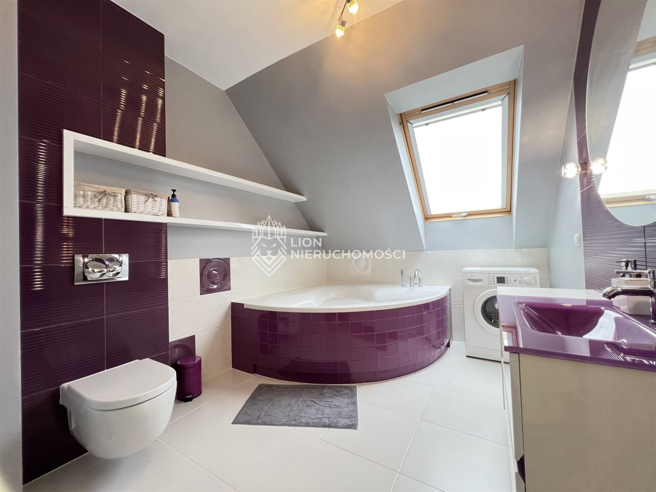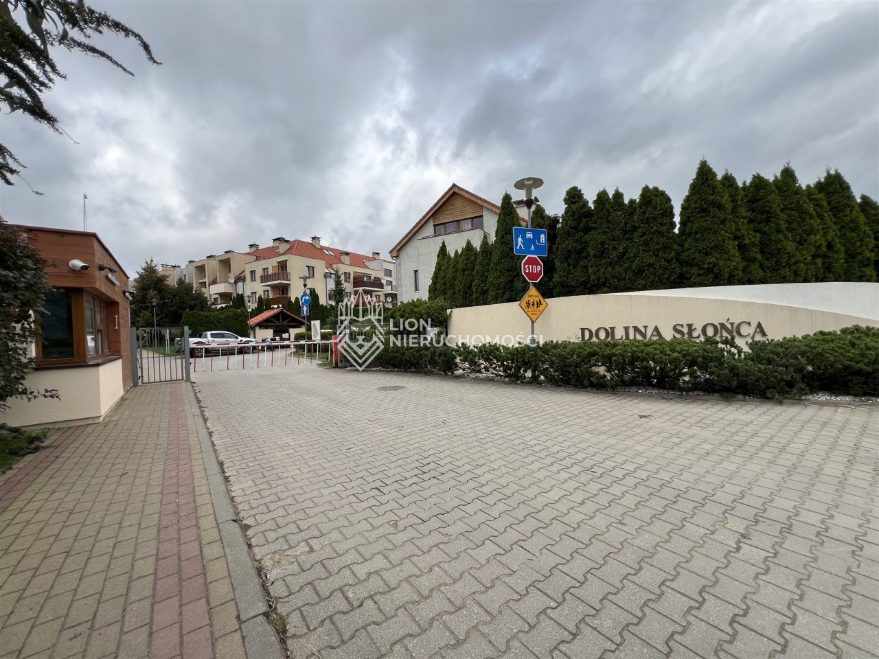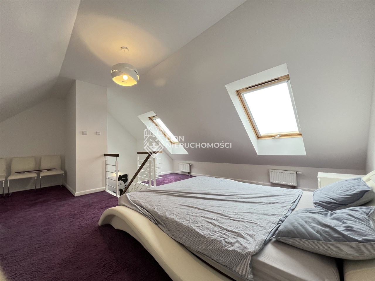 Dolny poziom nieruchomości stanowi przestronny salon z wyjściem na taras (zamontowana markiza) oraz półotwarta kuchnia. Kuchnia wyposażona we wszystkie niezbędne sprzęty. Na tym samym poziomie znajduje się pokój o powierzchni ponad 8 m2, duża łazienka z wanną oraz garderoba. W korytarzu zamontowana pojemna szafa wnękowa.