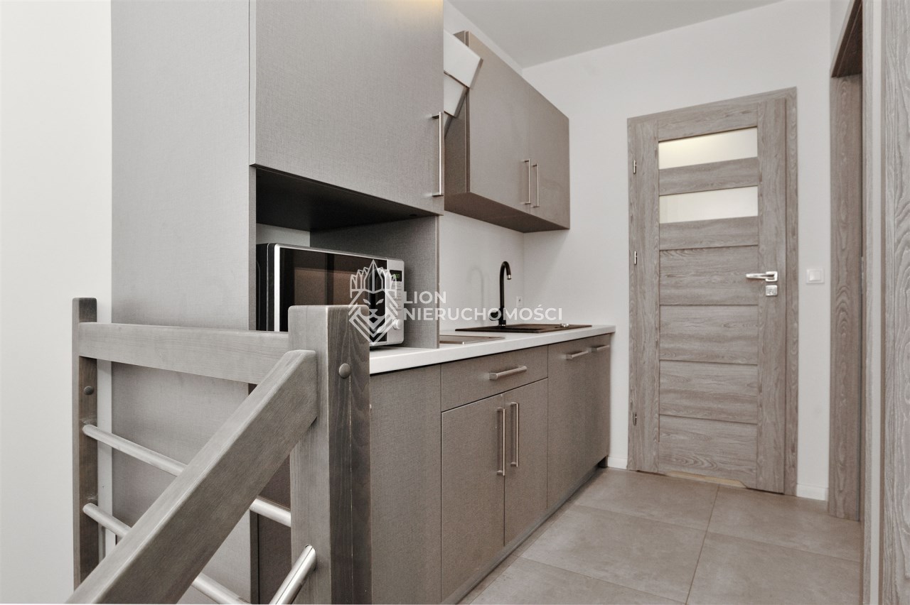 II poziom, dwie sypialnie z wyjściem na taras, łazienka z kabiną prysznicową oraz aneks kuchenny w korytarzu.