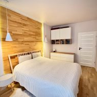 Sypialnia z łóżkiem o szerokości 160 cm, toaletką z lustrem i szafkami do przechowywania. Ma okno od strony północnej. Na podłodze deska drewniana trójwarstwowa.