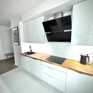 Kuchnia ma pełne wyposażeniem AGD (lodówka side by side, zmywarka, piekarnik, płyta indukcyjna i okap. Na podłogach deska drewniana trójwarstwowa, w kuchni płytki.