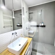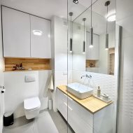 Łazienka z prysznicem typu walk in, wykończona dużymi płytkami. Prysznic jest bezbrodzikowy z odpływem liniowym, umywalka nablatowa. Dodatkowo duża szafka z szufladami pod umywalką oraz wc.