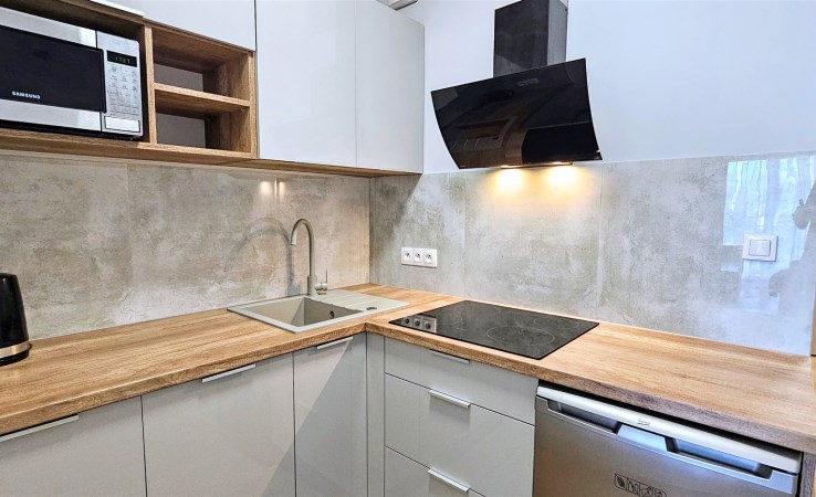 Do dyspozycji najemcy oprócz pełnego umeblowania jest telewizor i sprzęt AGD: pralko-suszarka, odkurzacz, kuchenka mikrofalowa, zmywarka, piekarnik, płyta indukcyjna, lodówka z zamrażarką, ekspres do kawy oraz naczynia i sztućce.