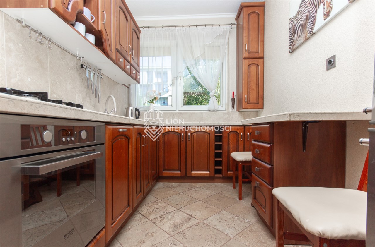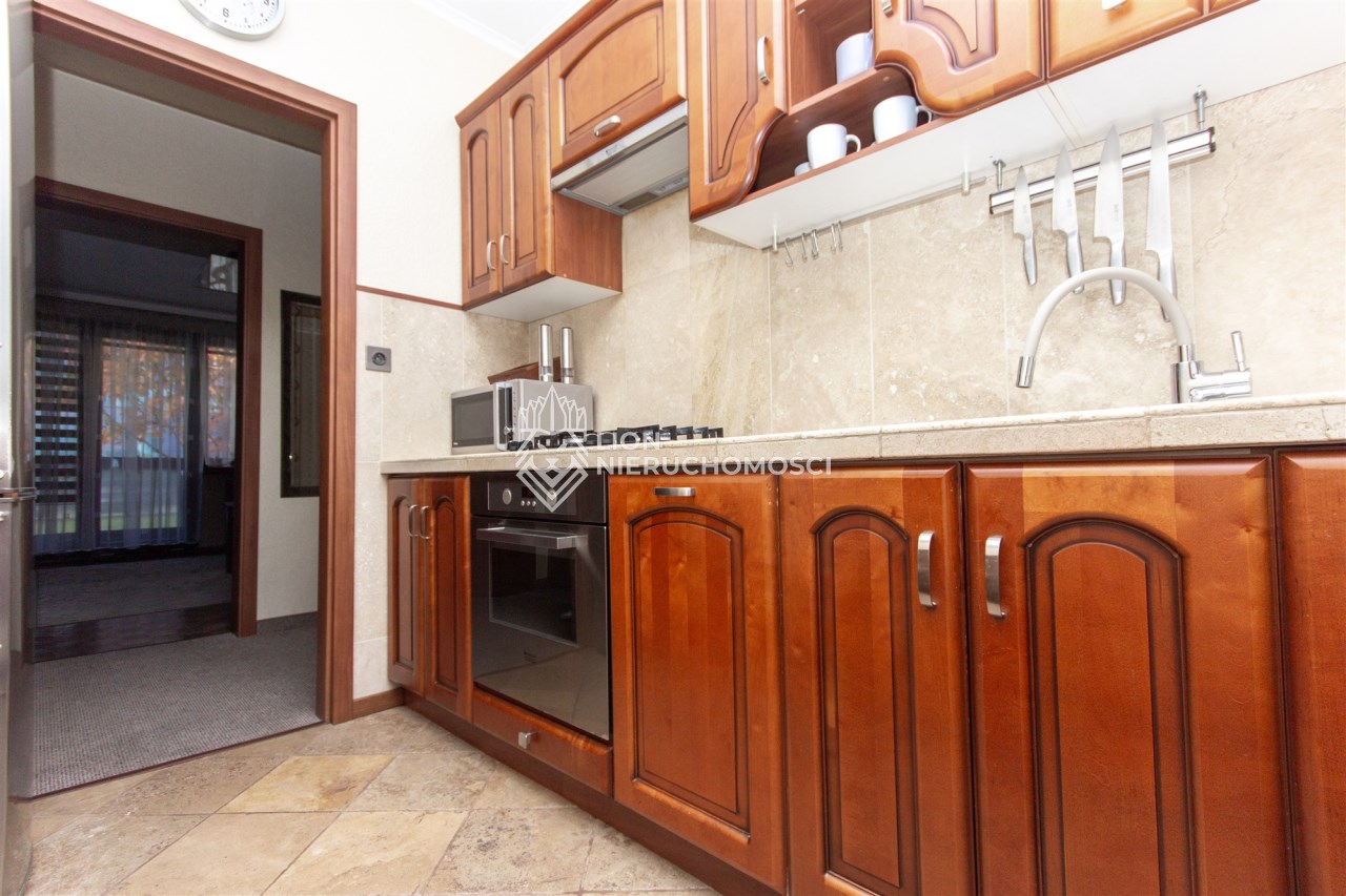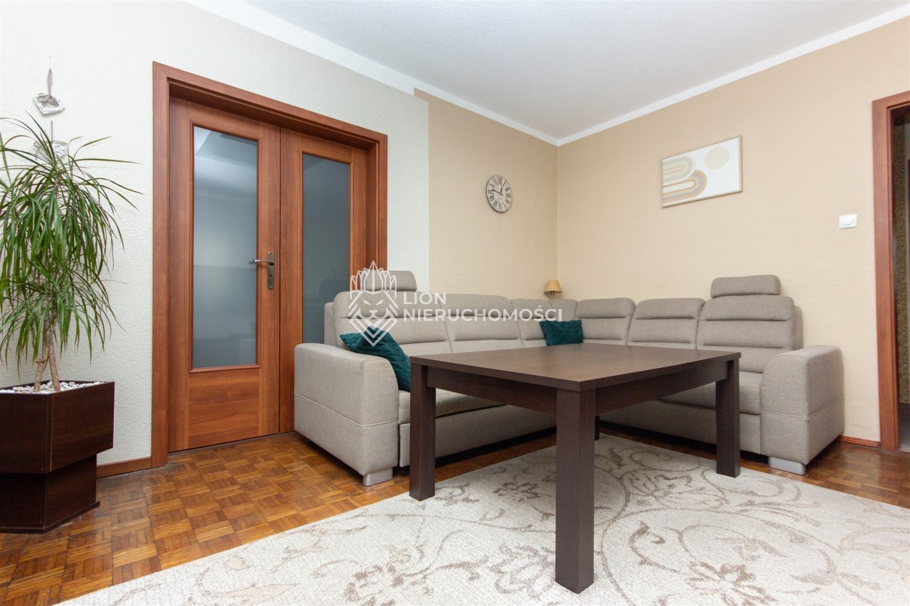 Mieszkanie składa się z: przestronnego hallu, trzech pokoi (w tym salonu przejściowego) oddzielnej kuchni w eleganckiej, drewnianej zabudowie, łazienki z wanną i WC oraz balkonu. Wnętrze urządzone zostało z dbałością o detale – drewniane podłogi, trawertyn w kuchni i wysokiej jakości meble tworzą przytulny i elegancki klimat.