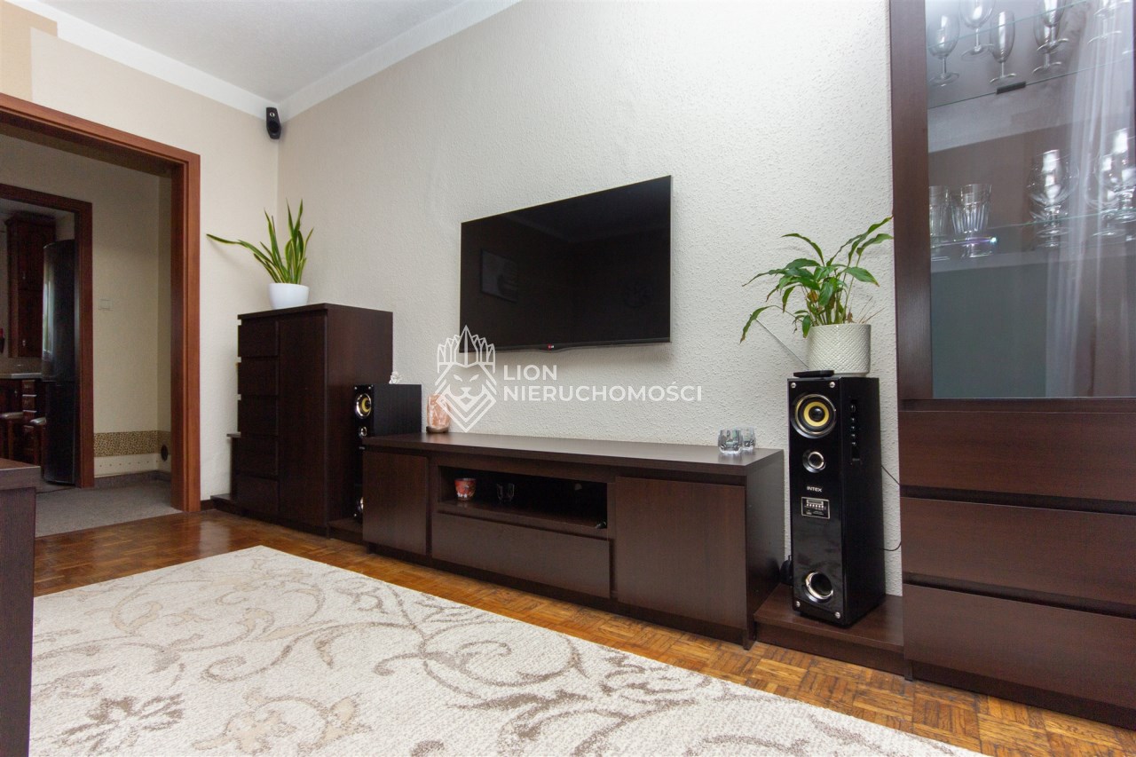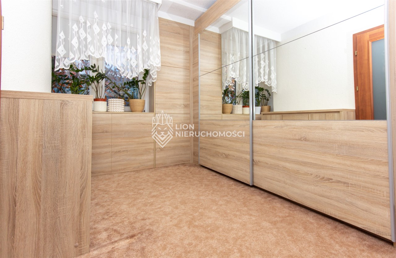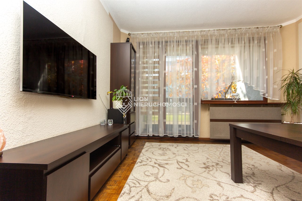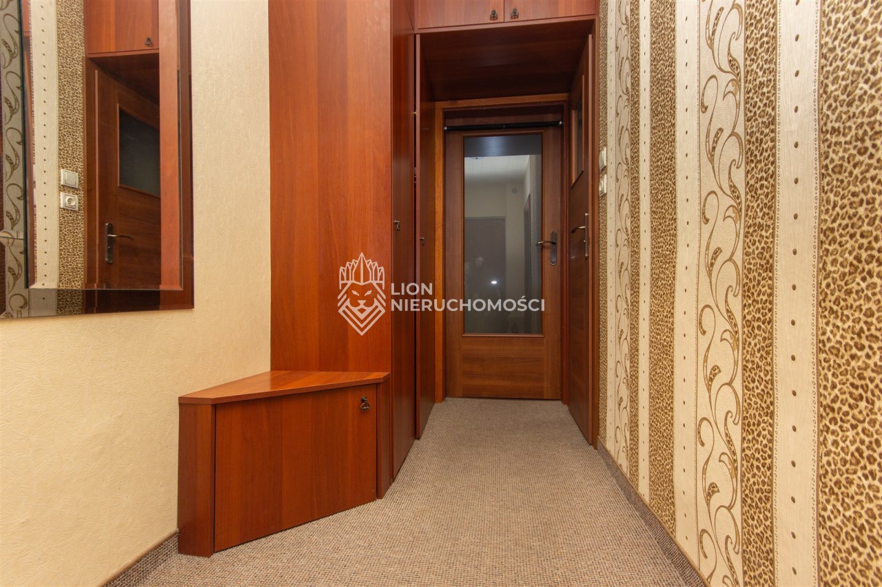 Mieszkanie składa się z: przestronnego hallu, trzech pokoi (w tym salonu przejściowego) oddzielnej kuchni w eleganckiej, drewnianej zabudowie, łazienki z wanną i WC oraz balkonu. Wnętrze urządzone zostało z dbałością o detale – drewniane podłogi, trawertyn w kuchni i wysokiej jakości meble tworzą przytulny i elegancki klimat.