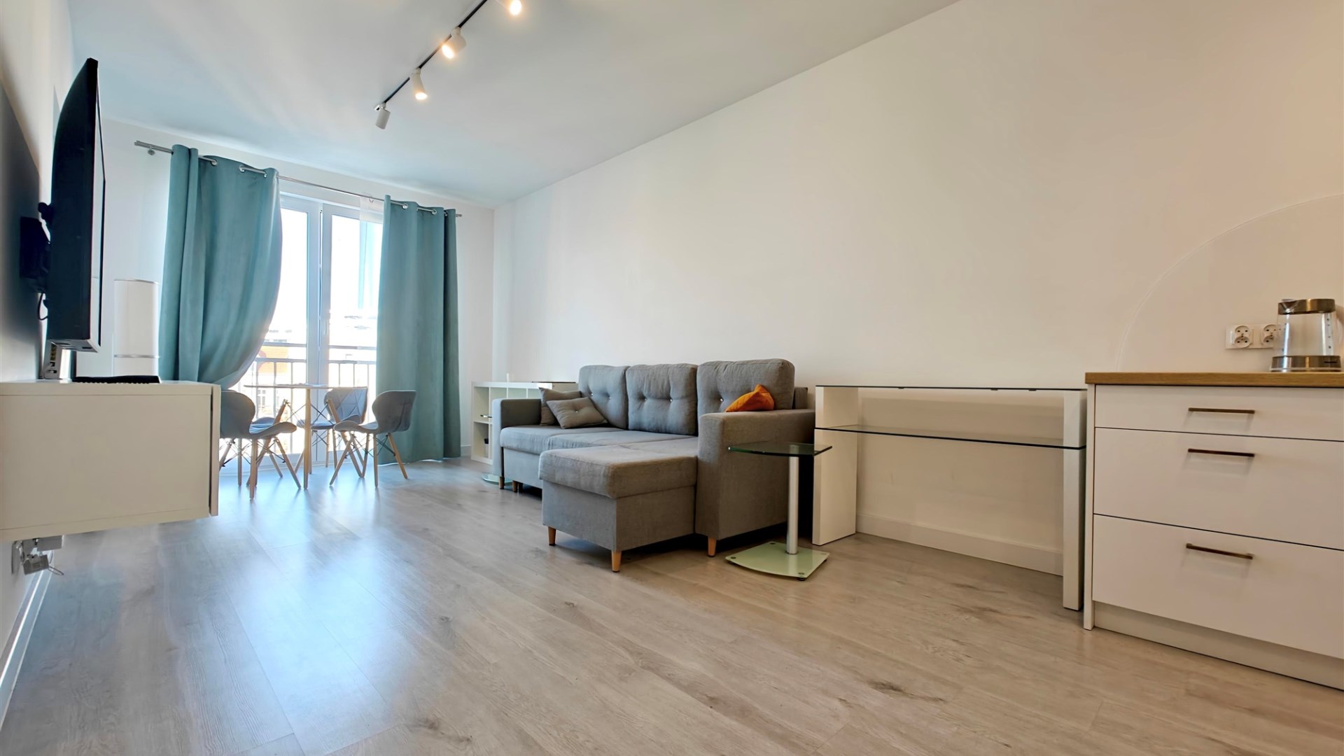 Salon: rozkładana sofa, telewizor,