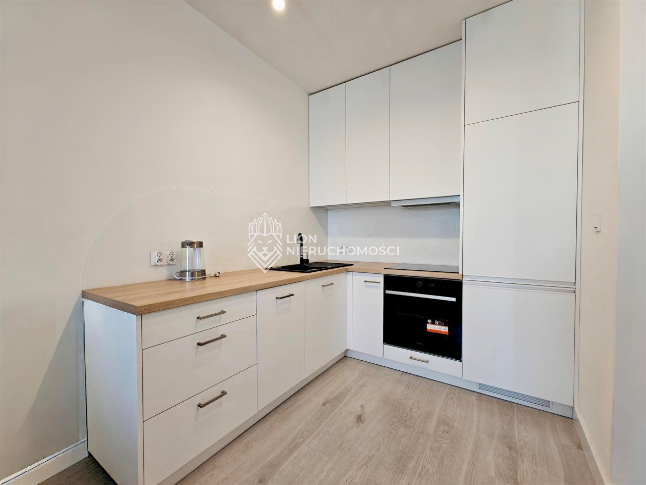 Kuchnia: lodówka z zamrażarką, zmywarka, piekarnik, płyta indukcyjna, okap, stół z krzesłami oraz drobne wyposażenie,