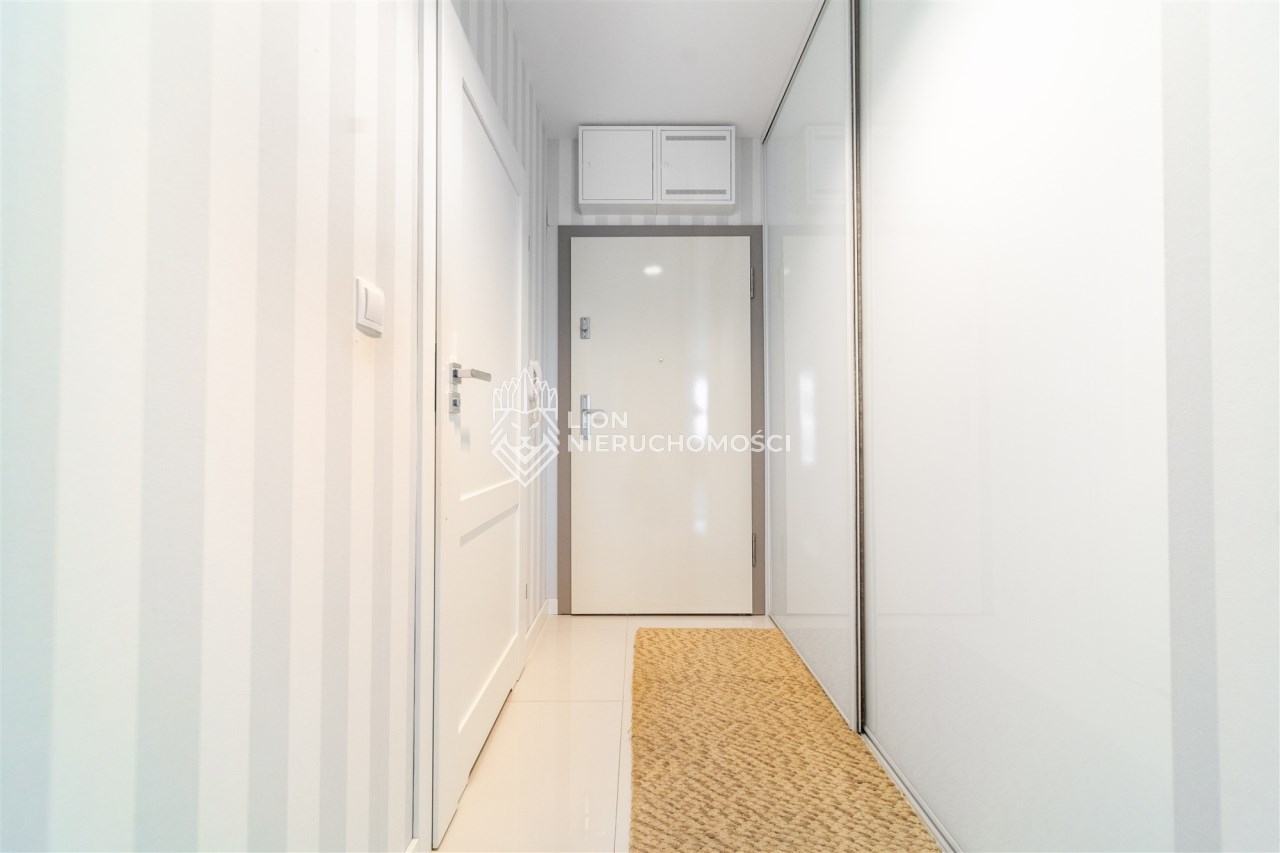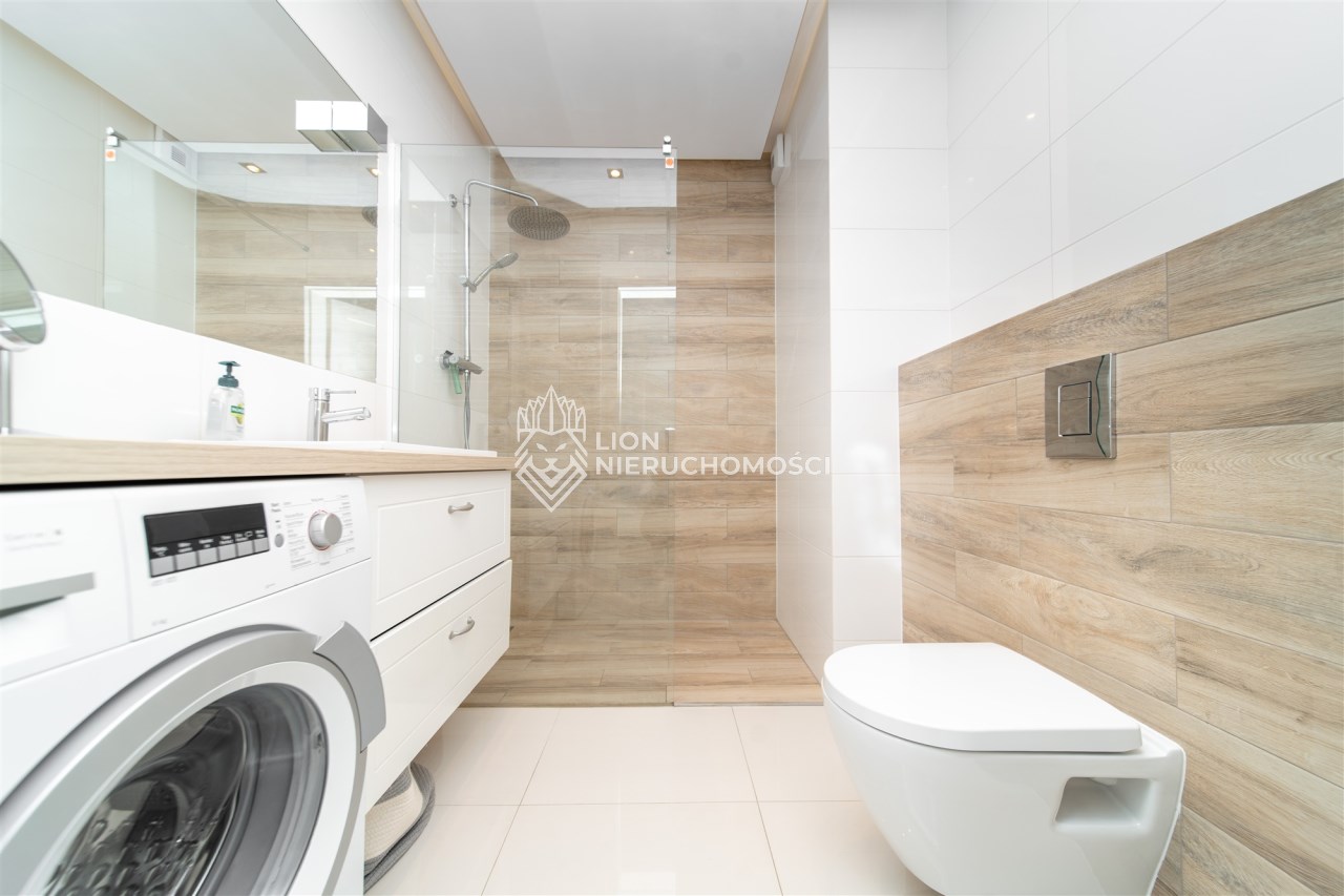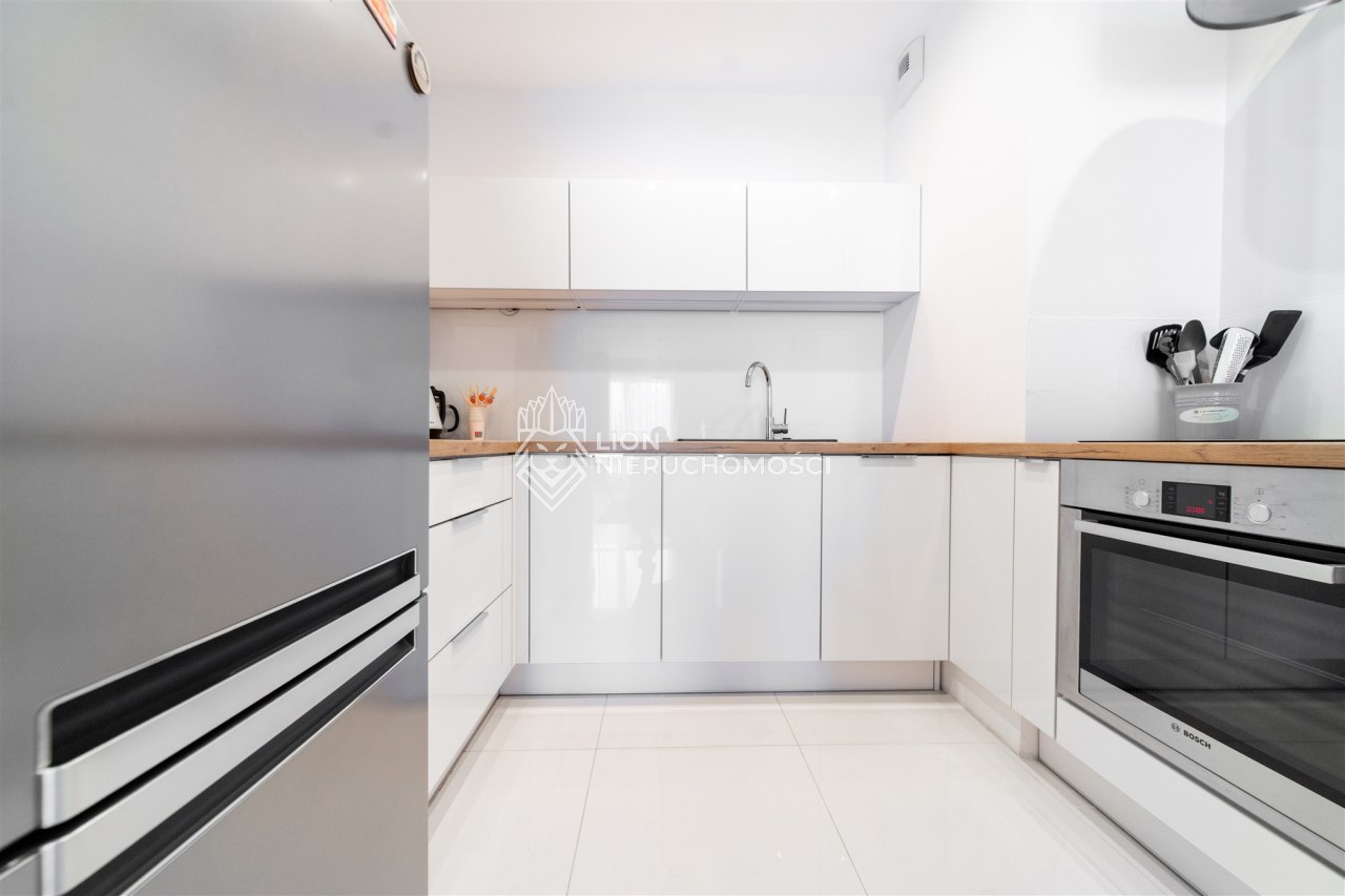 A luxurious apartment, definitely very high standard. Fully furnished and equipped with electronics and household appliances. In the living room there is a couch, a table, utility furniture and a TV set as well as balcony acces both from the living room and bedroom. Kitchen equipped with high-class household appliances (fridge freezer, induction hob, dishwasher, extractor hood, oven, microwave). The bedroom has a large double bed, utility furniture and a built-in wardrobe. There is also an exit to the terrace from the bedroom. Bathroom has a large shower.