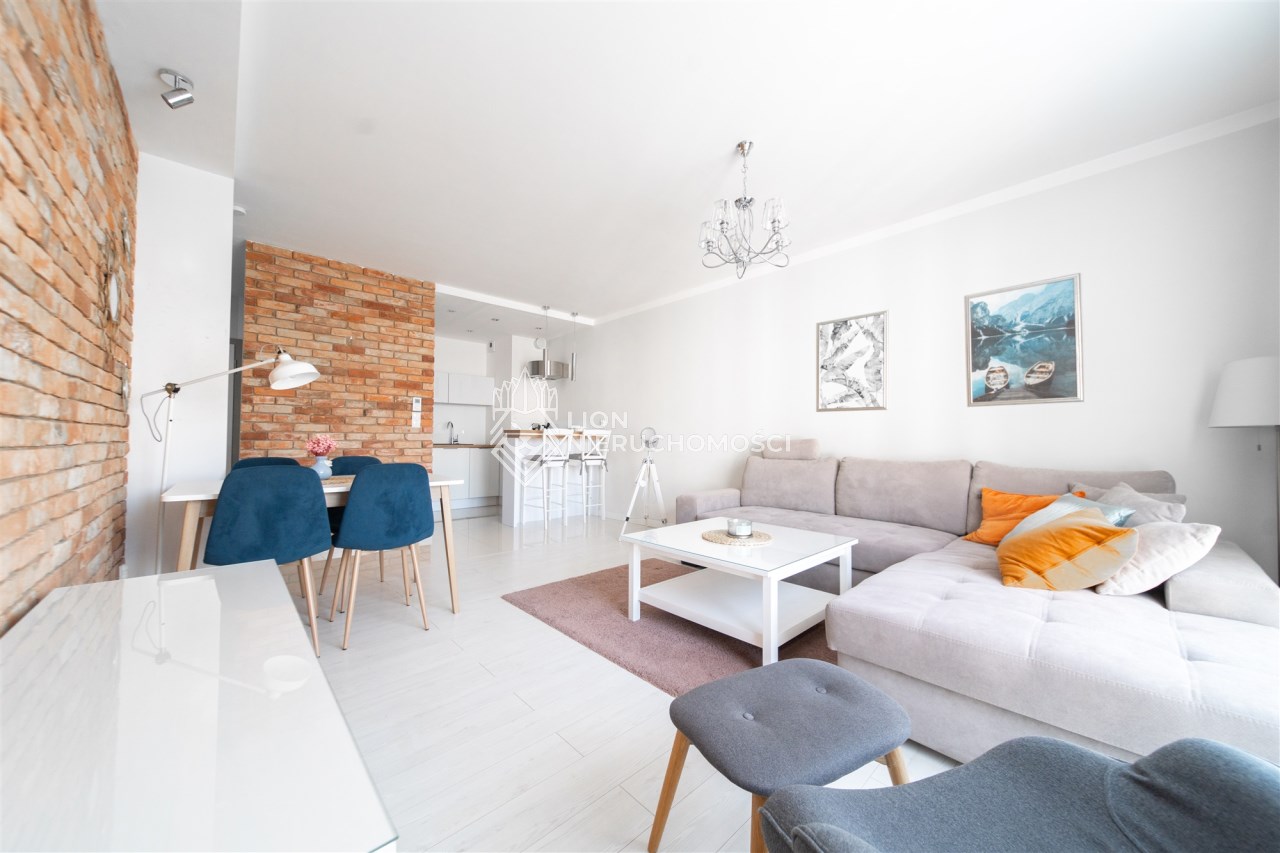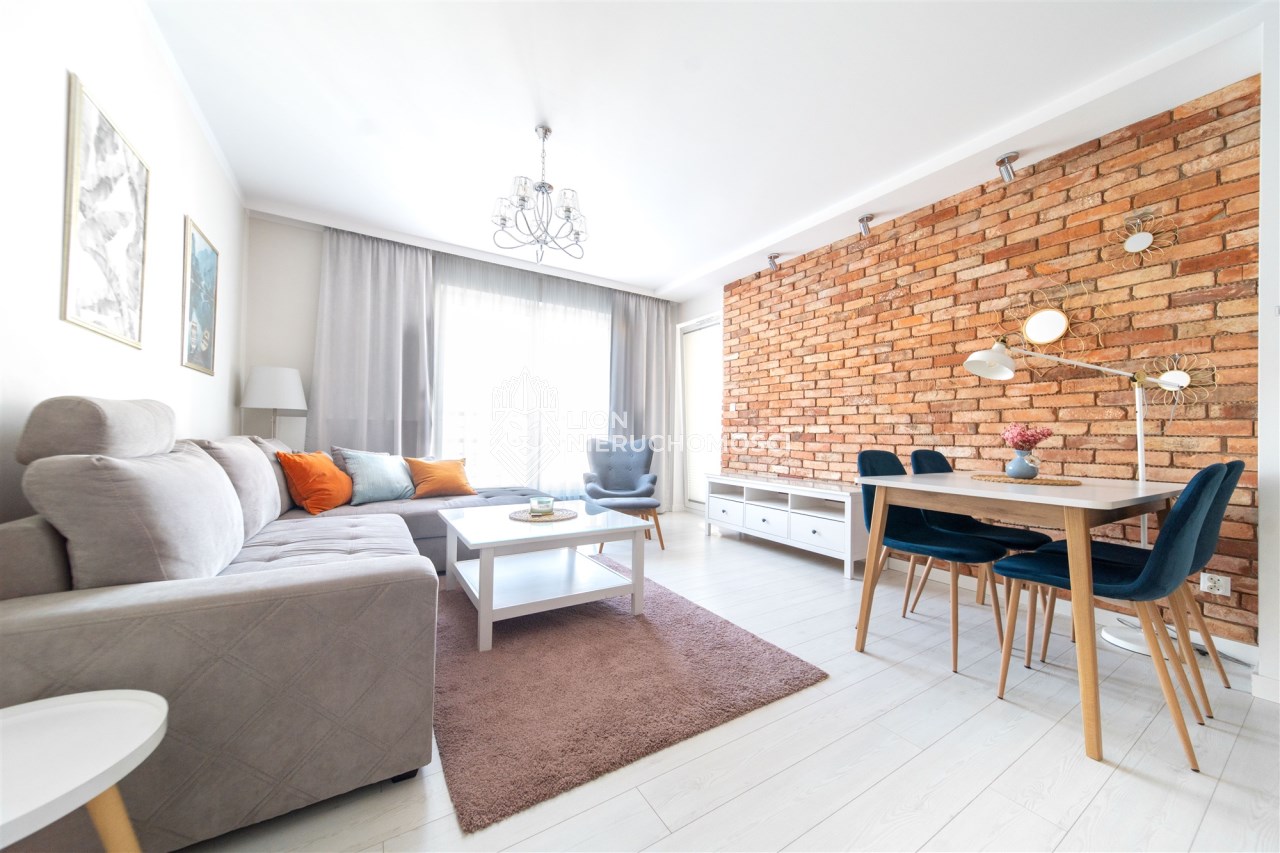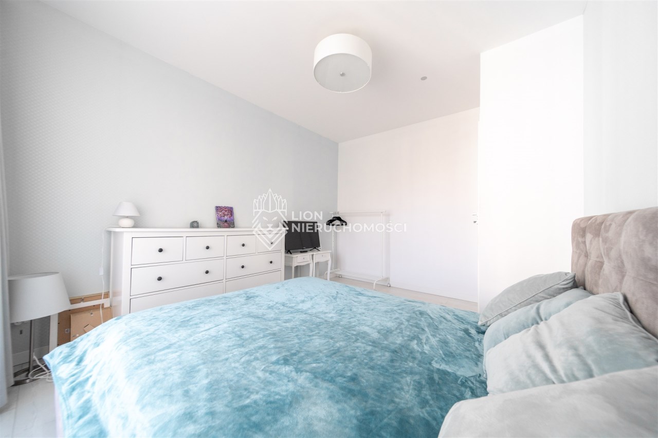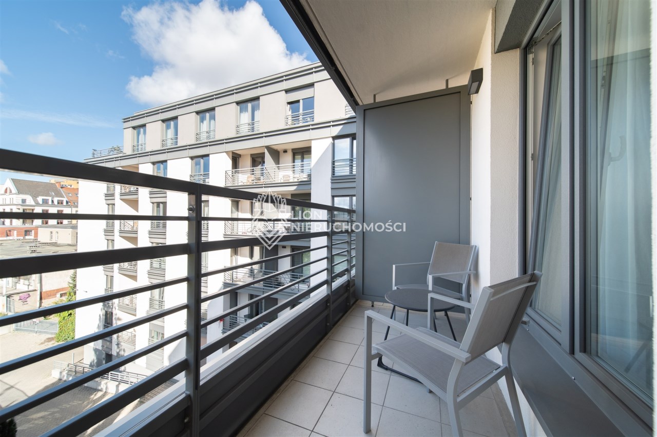 A luxurious apartment, definitely very high standard. Fully furnished and equipped with electronics and household appliances. In the living room there is a couch, a table, utility furniture and a TV set as well as balcony acces both from the living room and bedroom. Kitchen equipped with high-class household appliances (fridge freezer, induction hob, dishwasher, extractor hood, oven, microwave). The bedroom has a large double bed, utility furniture and a built-in wardrobe. There is also an exit to the terrace from the bedroom. Bathroom has a large shower.