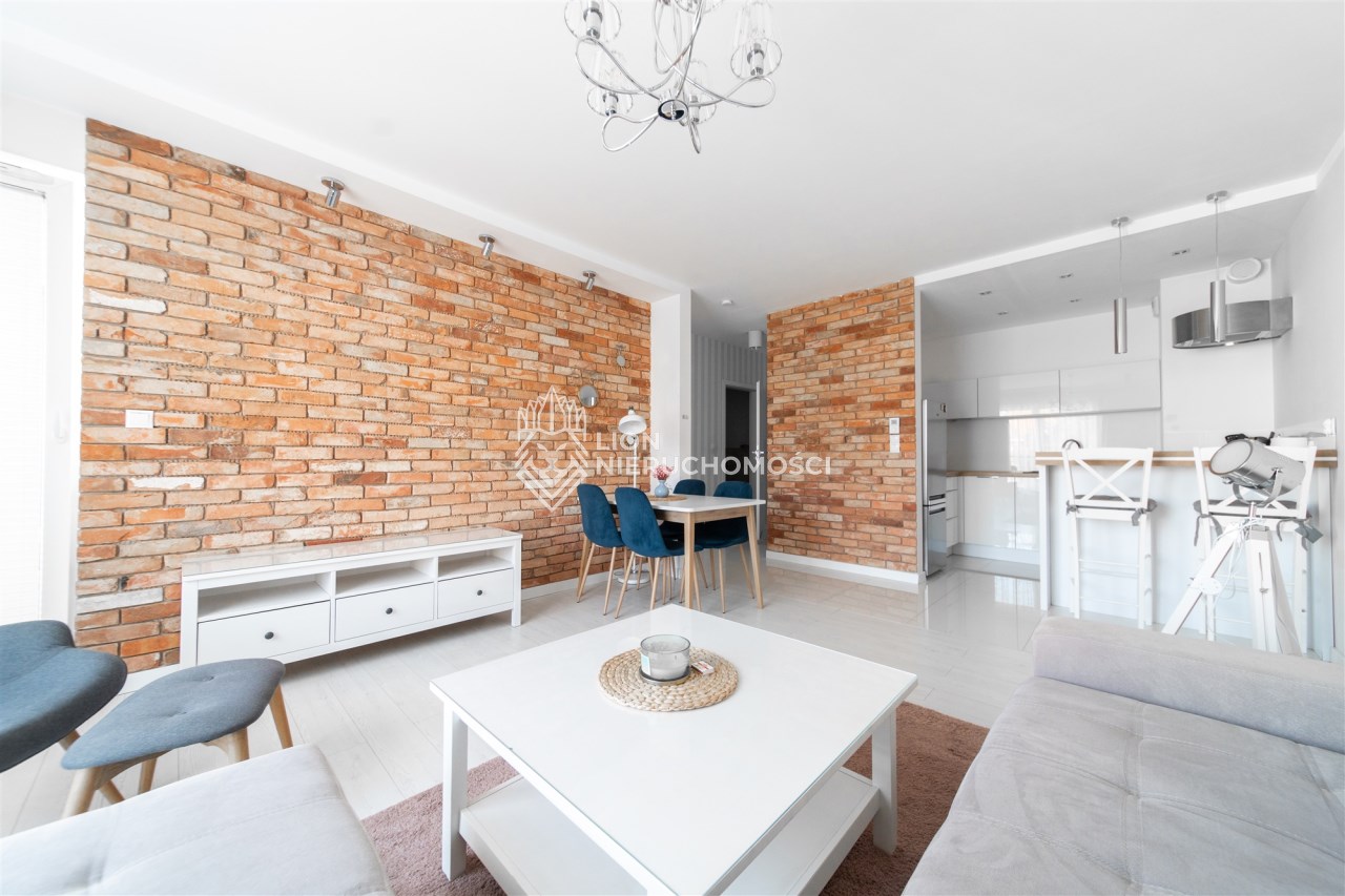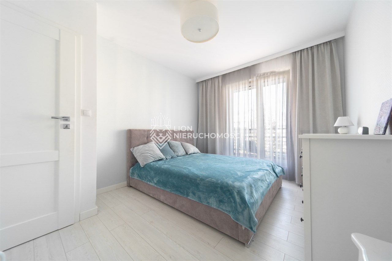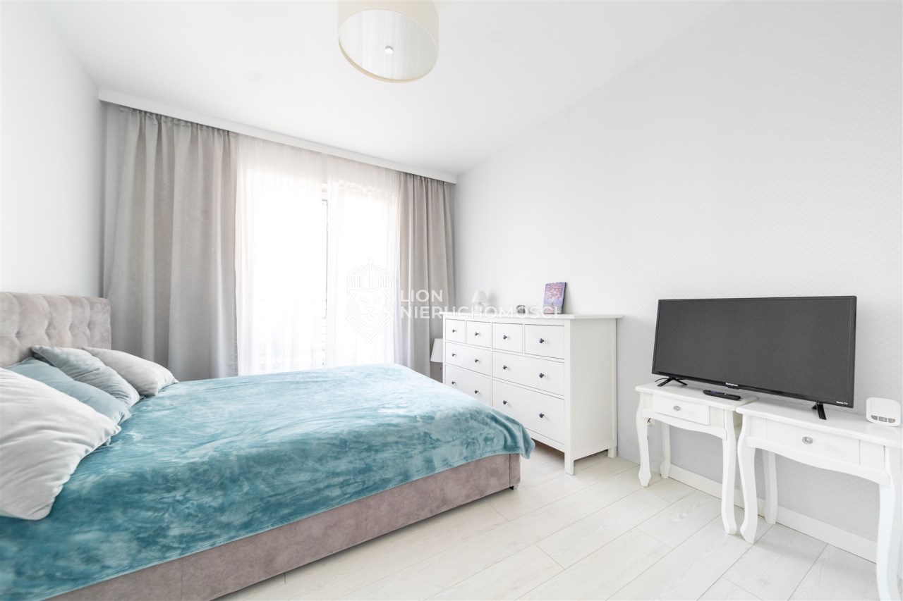 Luksusowy apartament, zdecydowanie reprezentuje bardzo wysoki standard. W pełni umeblowany oraz wyposażony w sprzęt RTV oraz AGD. W salonie narożnik, stolik, meble użytkowe oraz telewizor, z salonu wyjście na balkon. Między salonem a kuchnią znajduje się wyspa, kuchnia wyposażona w sprzęt AGD wysokiej klasy (lodówka z zamrażarką, płyta indykcyjna, zmywarka, okap, piekarnik, mikrofalówka). W sypialni duże dwuosobowe łóżko, meble użytkowe, szafa w zabudowie. Z sypialni również wyjście na taras. Łazienka z dużym prysznicem