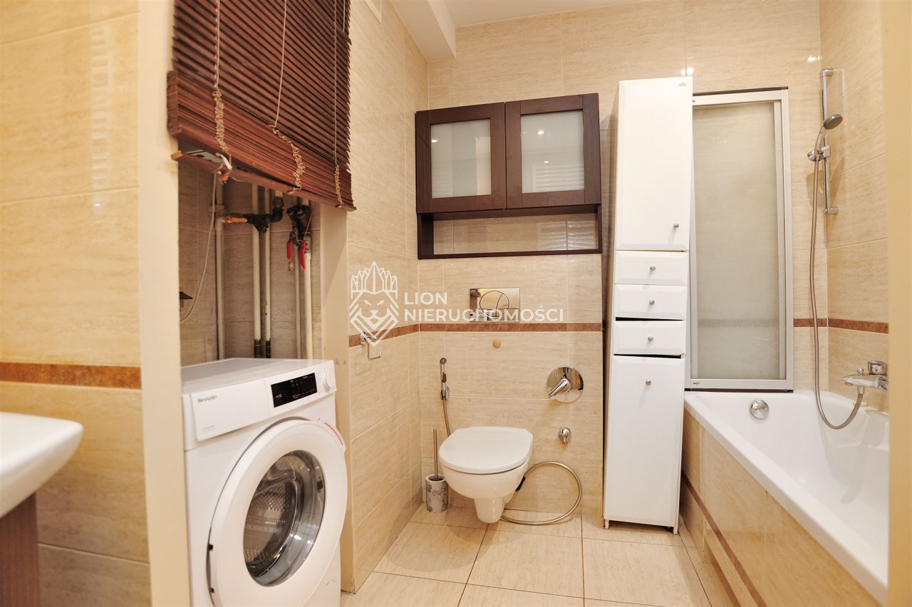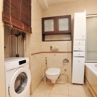 - Łazienka (5m2): wanna z zabudową szklano-aluminiową umożliwiającą jednoczesne korzystanie z prysznica, deszczownica HansGrohe. Pralka automatyczna. Umywalka z lustrem i szafką podumywalkową. WC kompaktowe z prysznicem bidetowym.